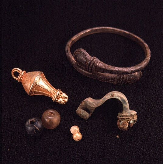 Armring, päronformat hänge, profilerad fibula och pärlor