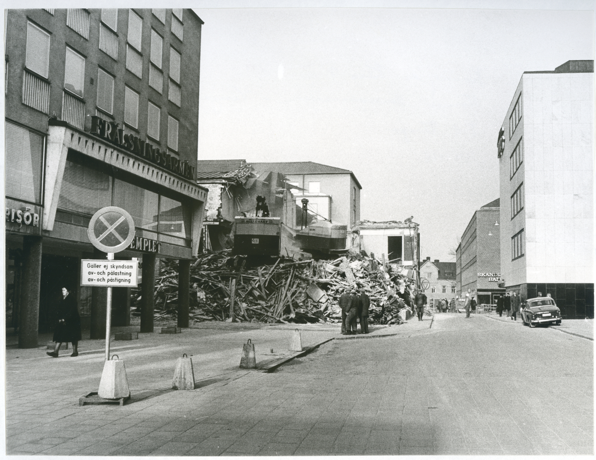 Rivningsarbete. Hantverkargatan mot öster, 1966.