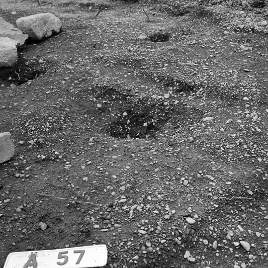 A8 Husgrund, markerad av lerklining, härdar och stolphål.