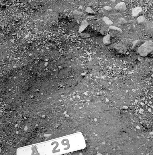 A8 Husgrund, markerad av lerklining, härdar och stolphål.