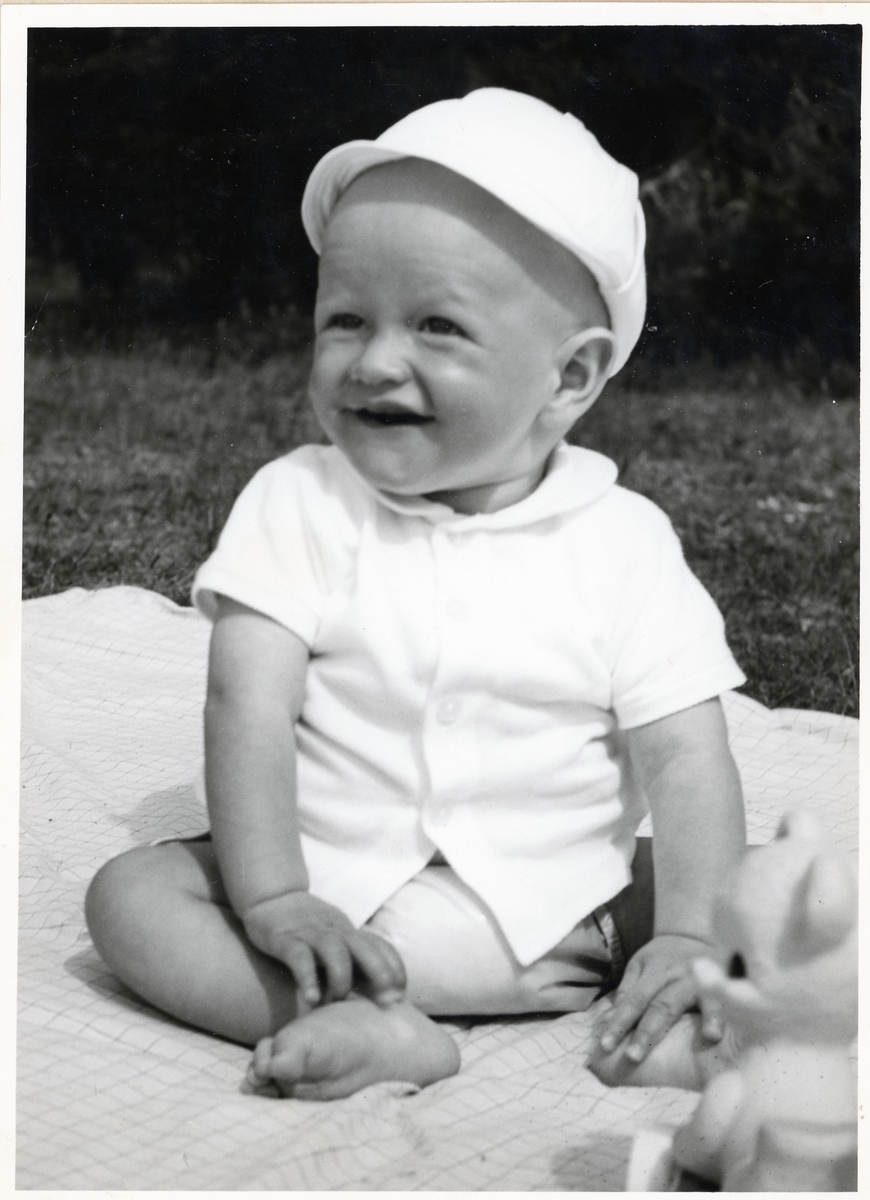 Fotografi på Ola som är på Öland sittande på en filt med en leksak, 1963.