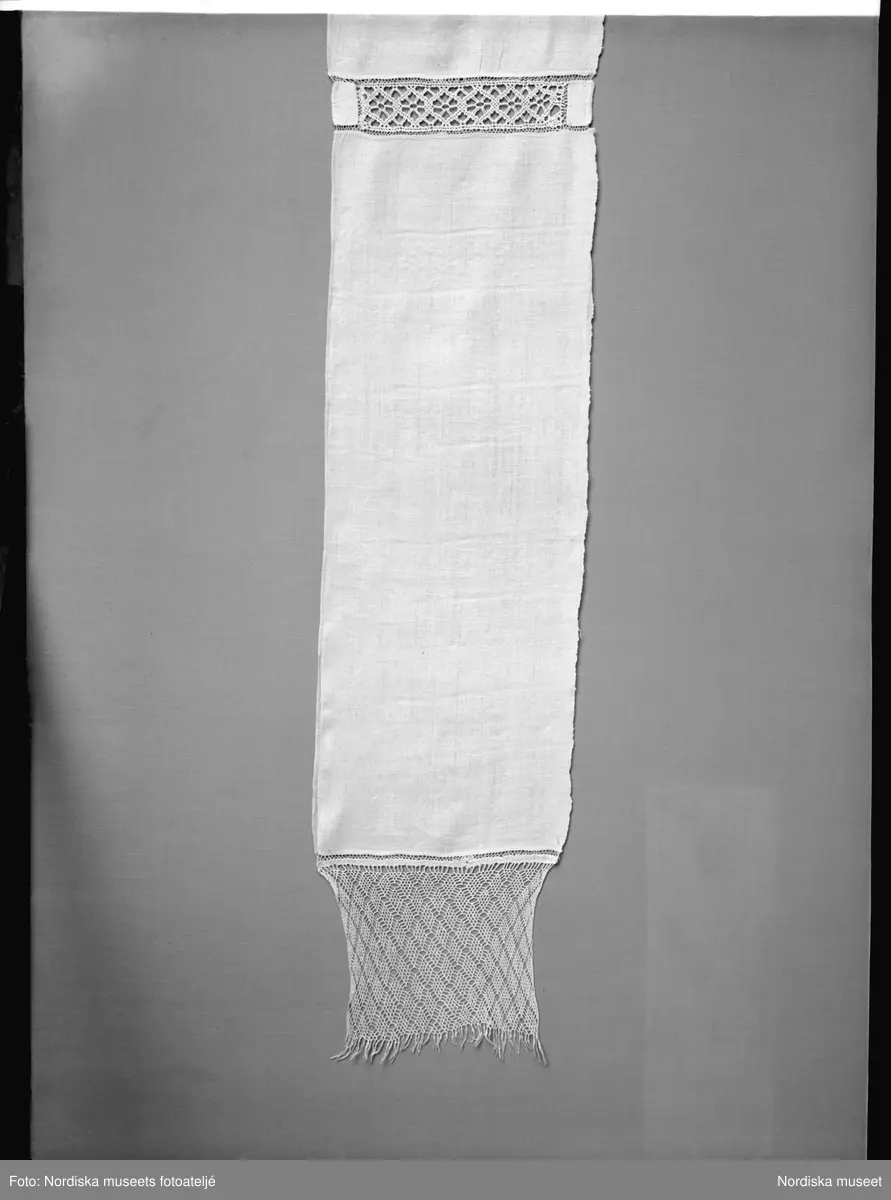 Katalogkort med foto tillhörande NM.0204696. Påskrift Handkläde knyppling, flätning. Hälsingland Alfta sn. Malvik. Handkläde med knyppling och flätning. L. 160 cm., br. 32 cm. Lärft av vänsterspunnet lingarn 15 varp- och 12 inslagstrådar på 1 cm. Fyrflätning med 8 varptrådar tillsydd medelst slingsöm. / cm bred knypplad spets infälld med slingsöm. Knypplingen av grovt högertvinnat lingarn.