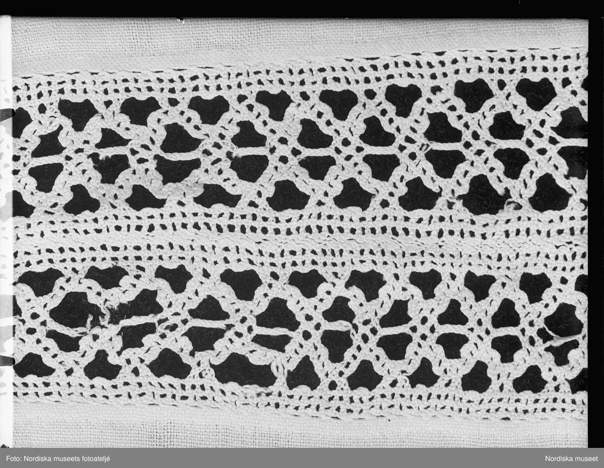 Katalogkort med foto. Påskrift H-b-f. Ovanåker Väggduk, knyppling. Hälsingland Ovanåkers sn. L. 245 cm., br. 106 cm. Lärft av (otydligt) ling., 16 varp o 15 inslagstr. på 1 cm. Spetsar 5 cm. br. o kantspets runt om 3 cm. bred knypplade av högertvinnat ling. Märkt i ett hörn E m blått ling. i stjälksöm. Äg. Ovanåkers Hembygdsförening Norr-Edsbyn Lån 1935. E.U.9214.