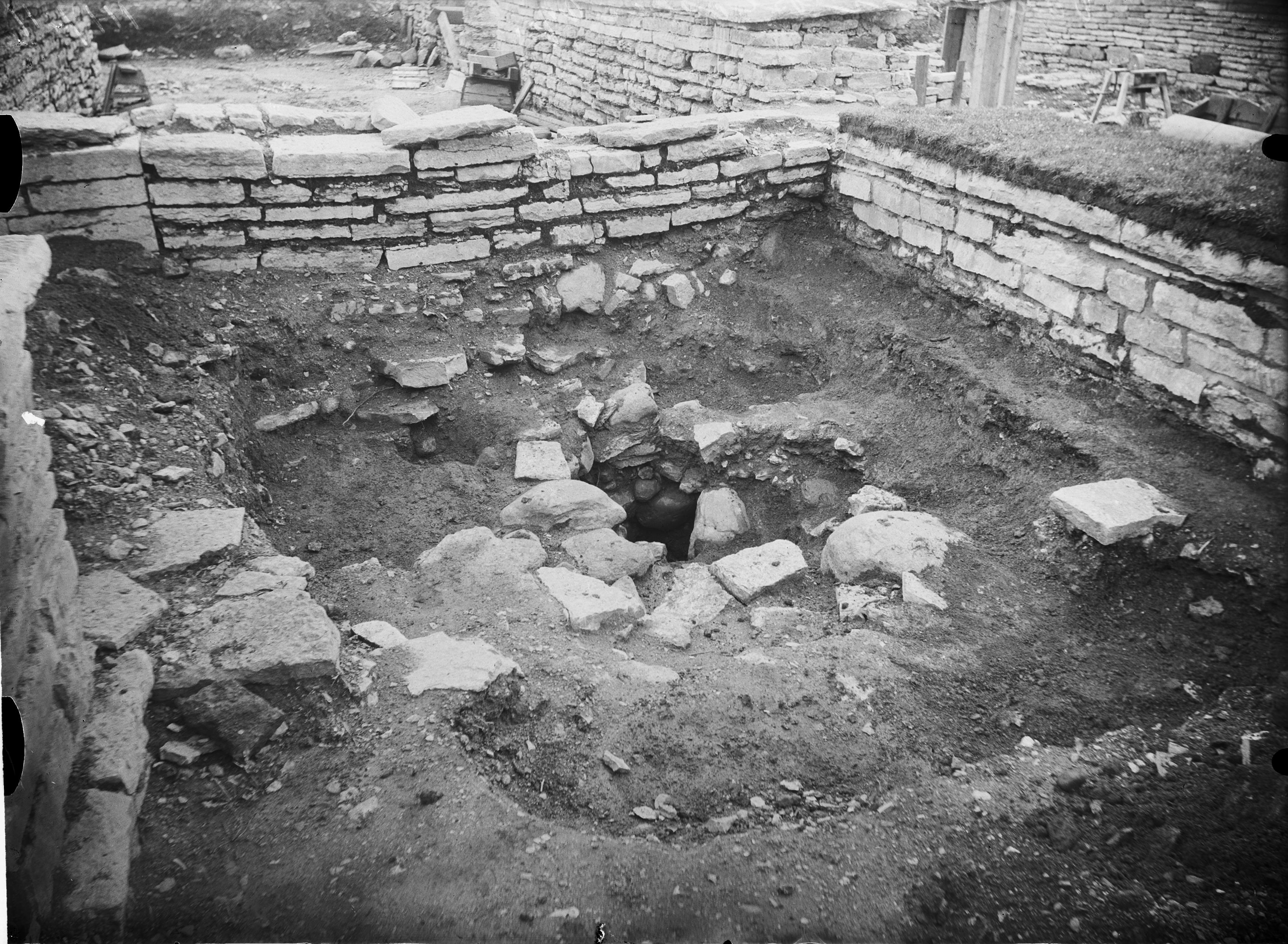 Fr. Malmborgs undersökning. Brunnen i korsgångens sydvästra hörn. Från nordöst. I mitten den senare tillkomna tvärmuren vid västra längans södra ända. Till höger västra längans västra mur färdigkonserverad.