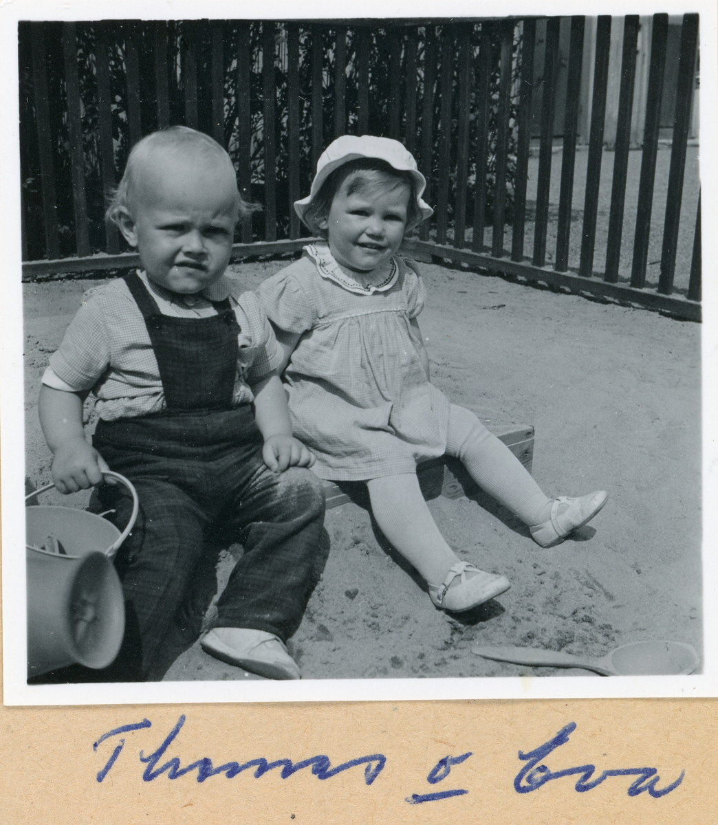 Bild på Thomas och Eva i sandlådan, sommaren 1958.