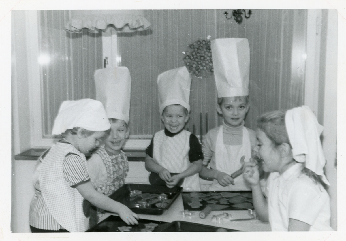 Fotografi på en barnaskara som bakar pepparkakor : Ingrid, Carl-Axel, Joakim, Per, och Anna-Karin, Monika och Svens barn.