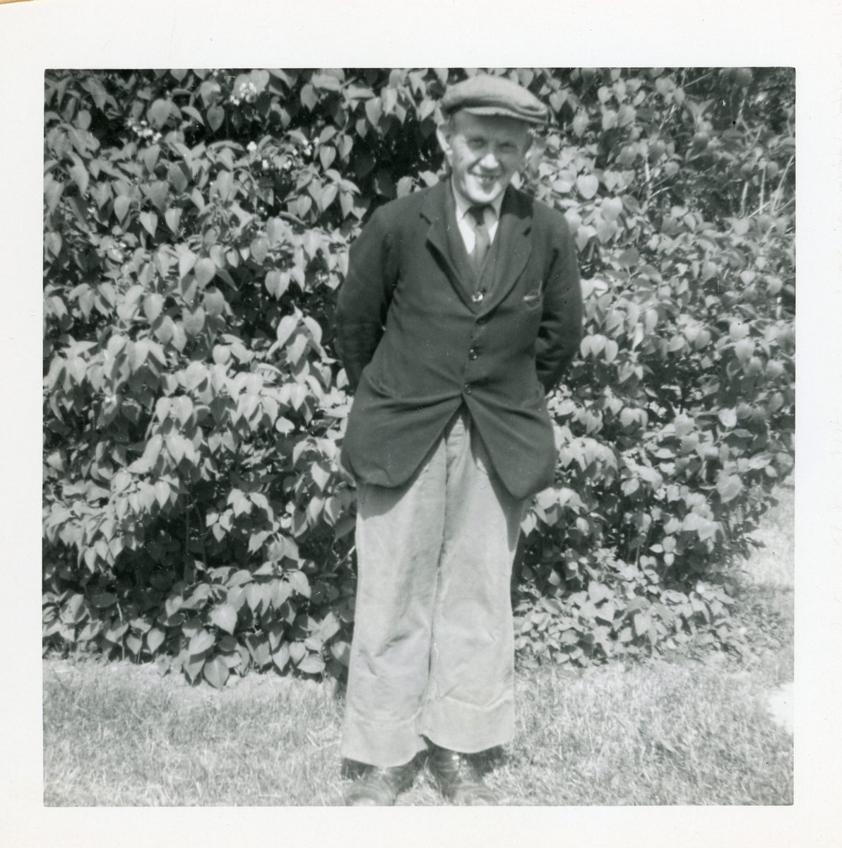 Titel: Fotografi på en man vid namn Westberg ståendes framför en buske.