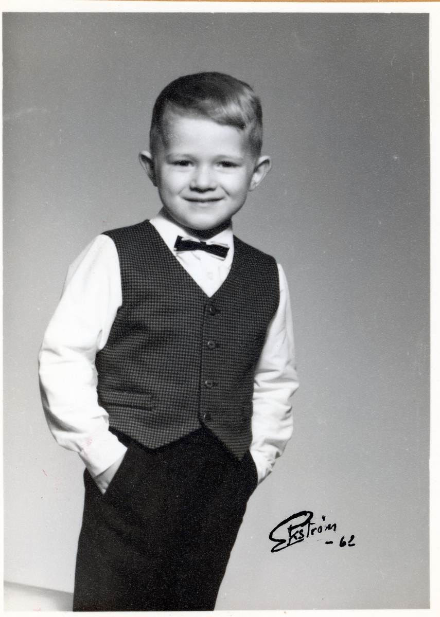 Fotografi på Mikael 4 år med skjorta, väst och fluga.