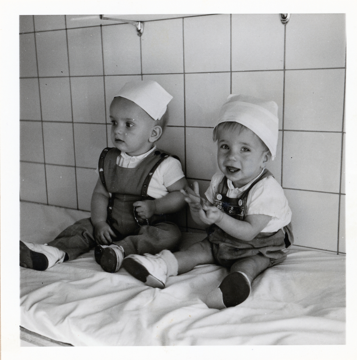 Fotografi på Urban och Anders med hängselbyxor sittandes på en bänk, troligen i Lilla Källbäck.
