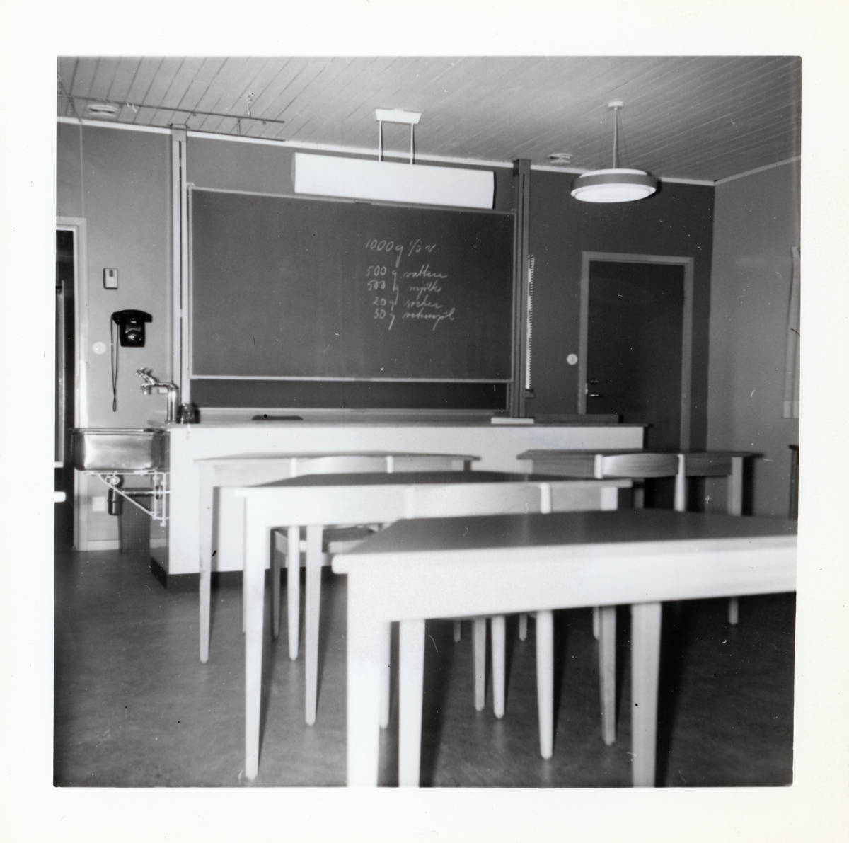Titel: Fotografi på teorilokalen på Lilla Källbäck, färdig att användas 1:a september 1962.
