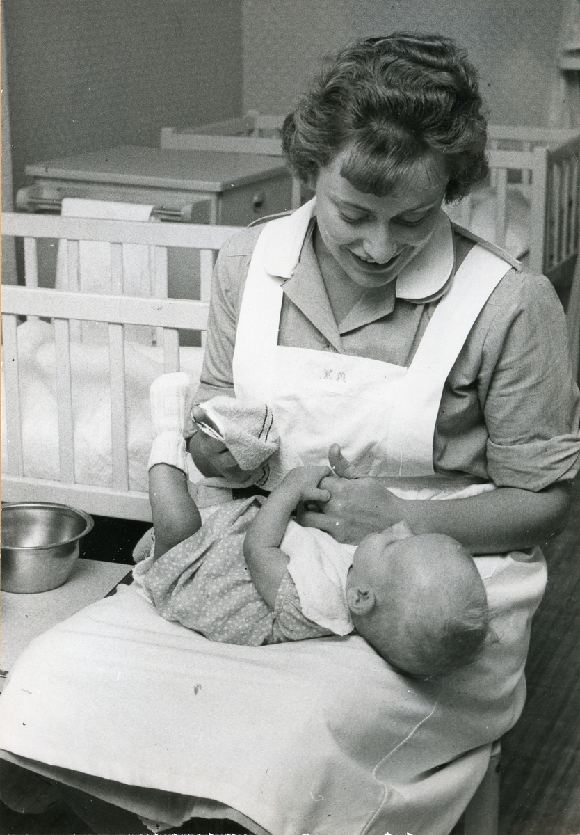 Fotografi på Kerstin Majgård, barnsköterska, med telning.