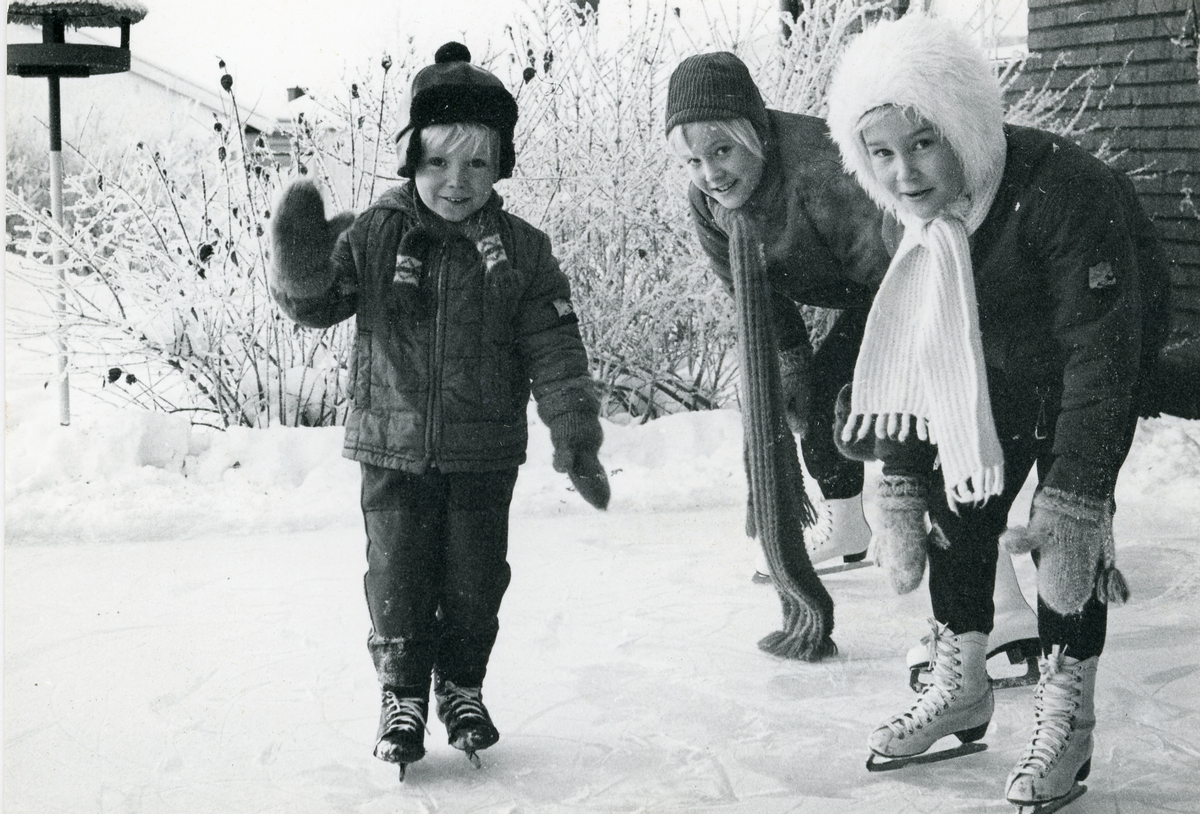 Fotografi på tre barn, två flickor och en pojke, åkandes skridskor, 1969.