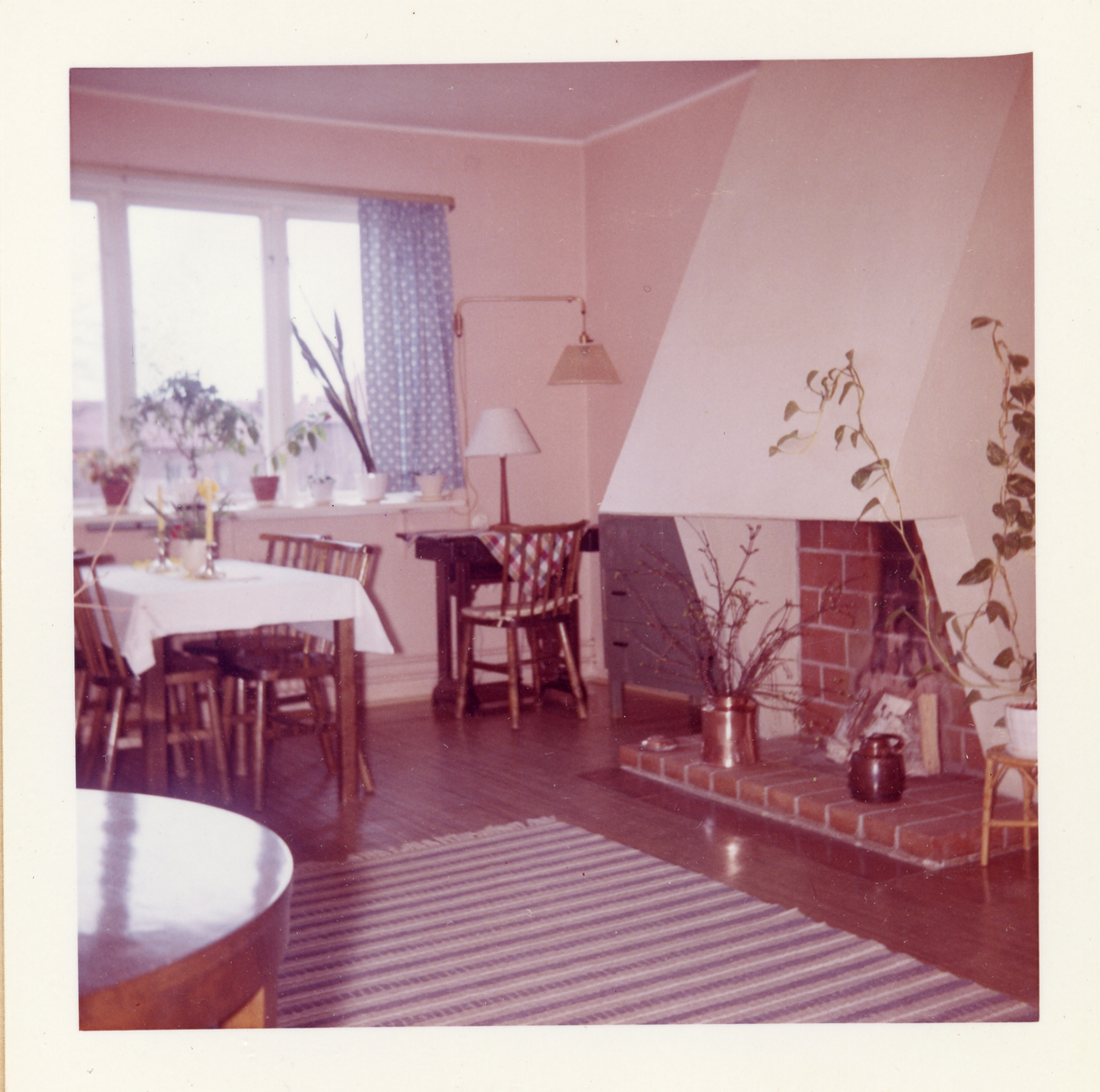 Fotografi på vardagsrummet med öppen spis, bord och stolar vid barnhemmet Lilla Källbäck, påsken 1962.