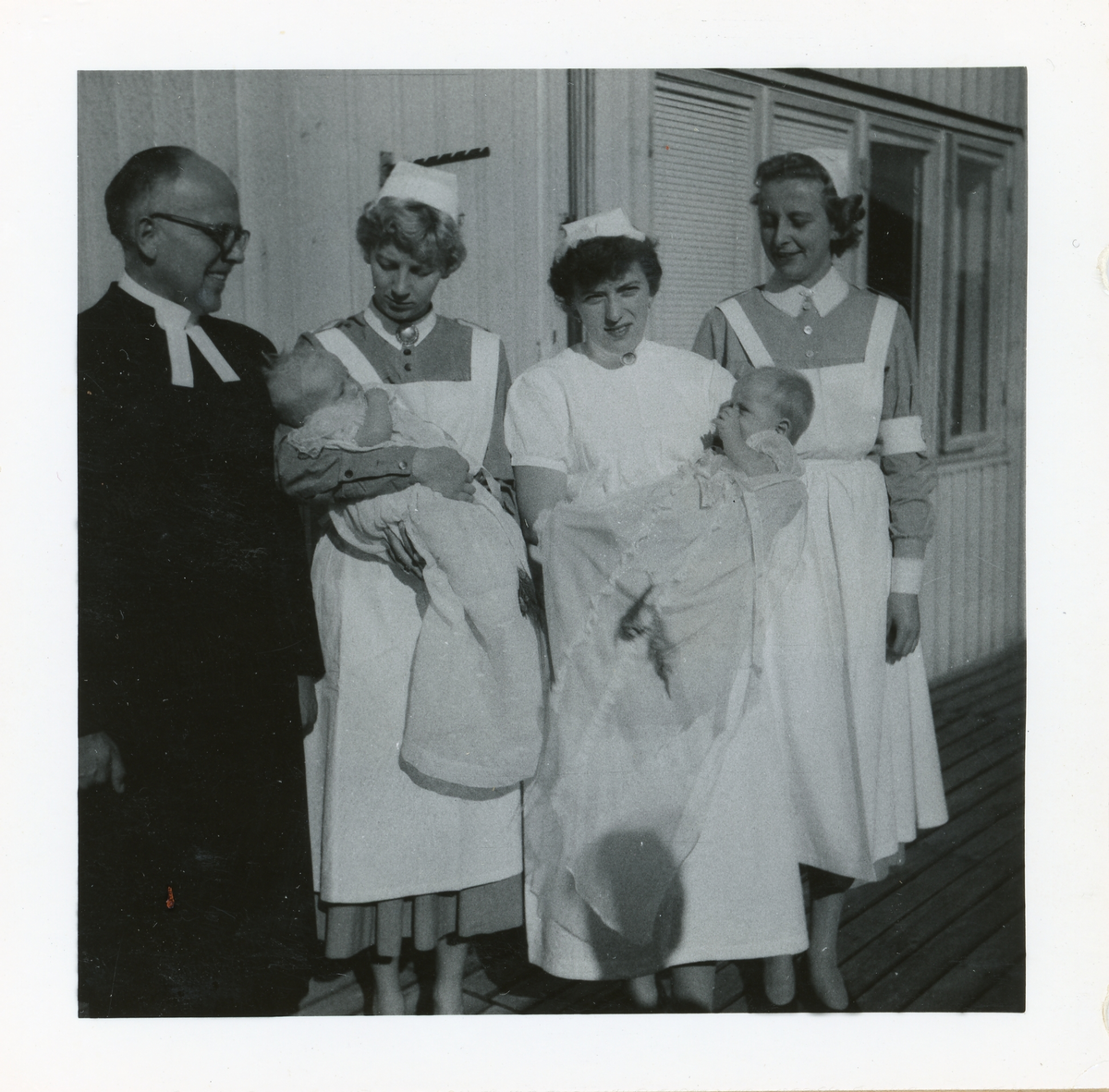 Foto med Michel och Nils-Åke på deras dopdag samt pastor Bäckström och tre barnsköterskor.