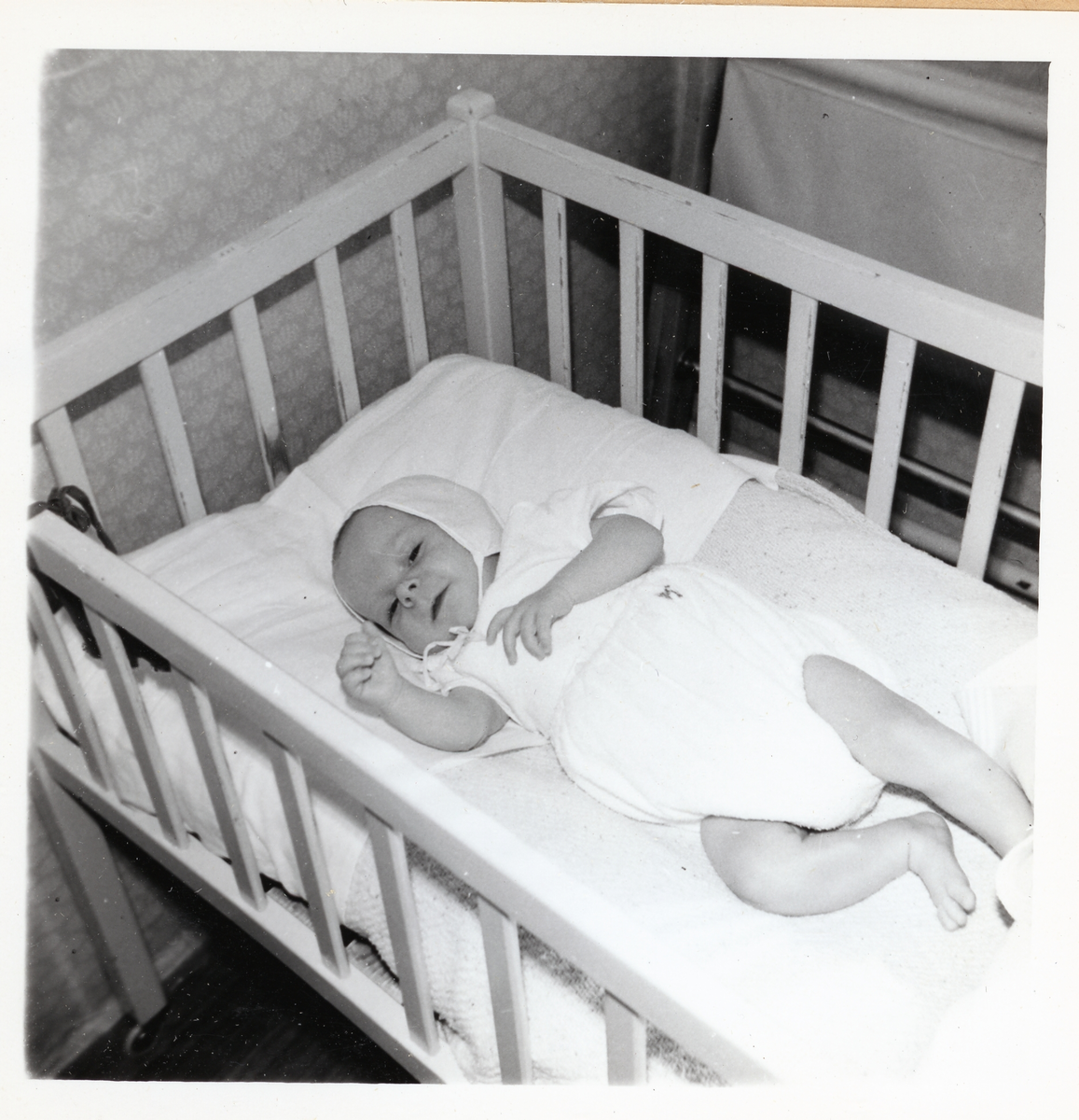 Fotografi på Leif som ligger i sin spjälsäng i Lilla Källbäck.