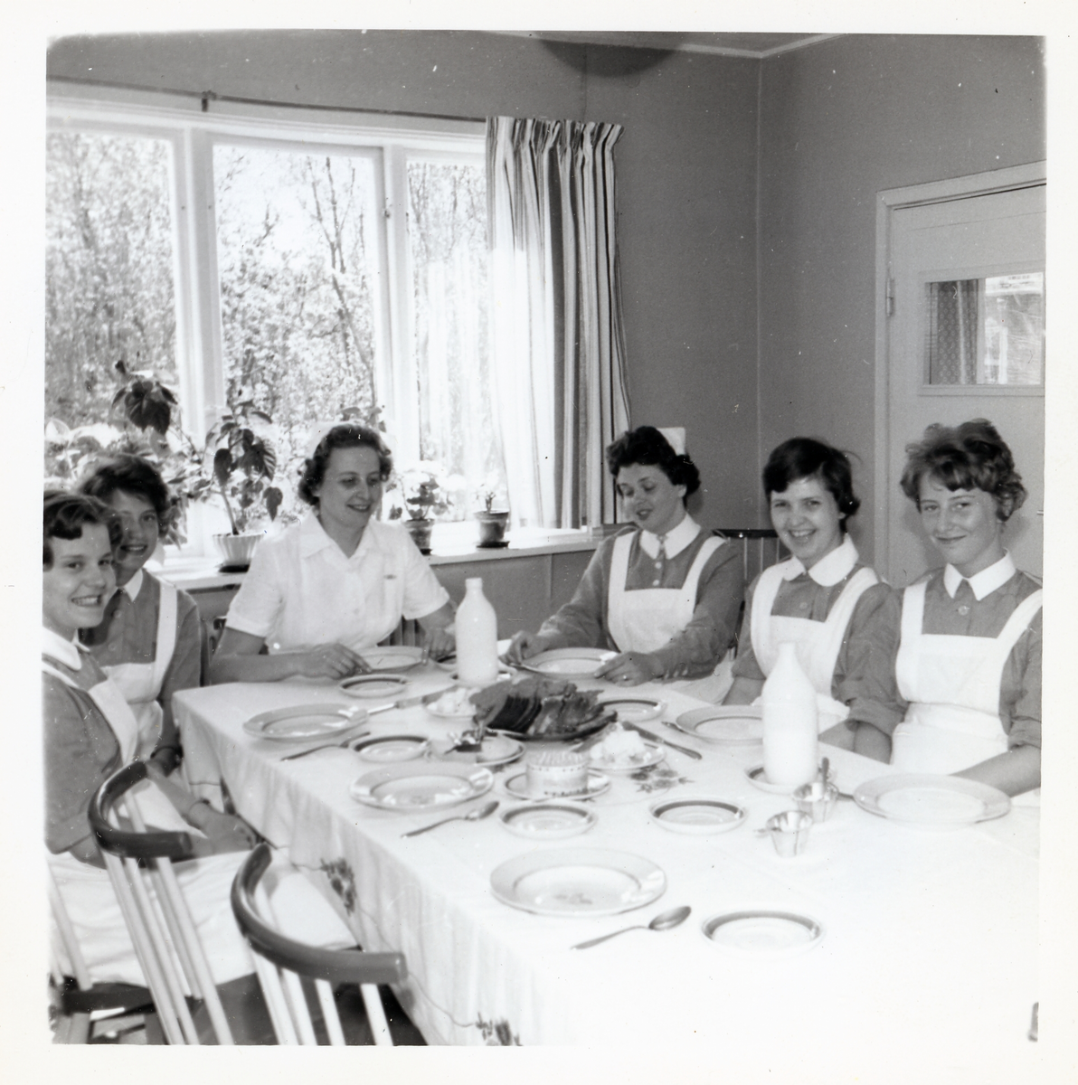 Fotografi på barnsköterskor som intar frukost vid Lilla Källbäck.