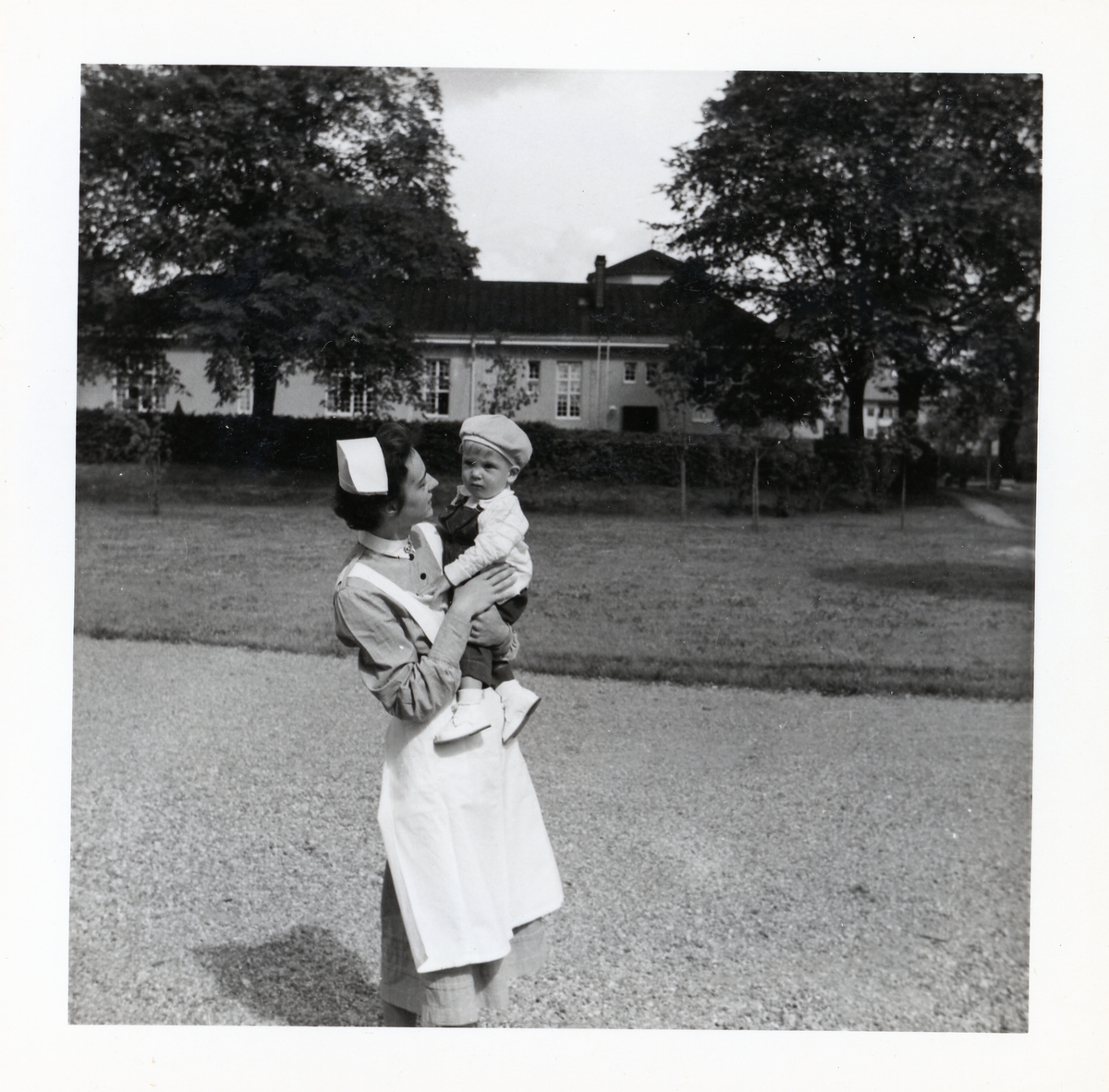 Fotografi på en barnsköterska som bär på Sven-Olof vid Lilla Källbäck.