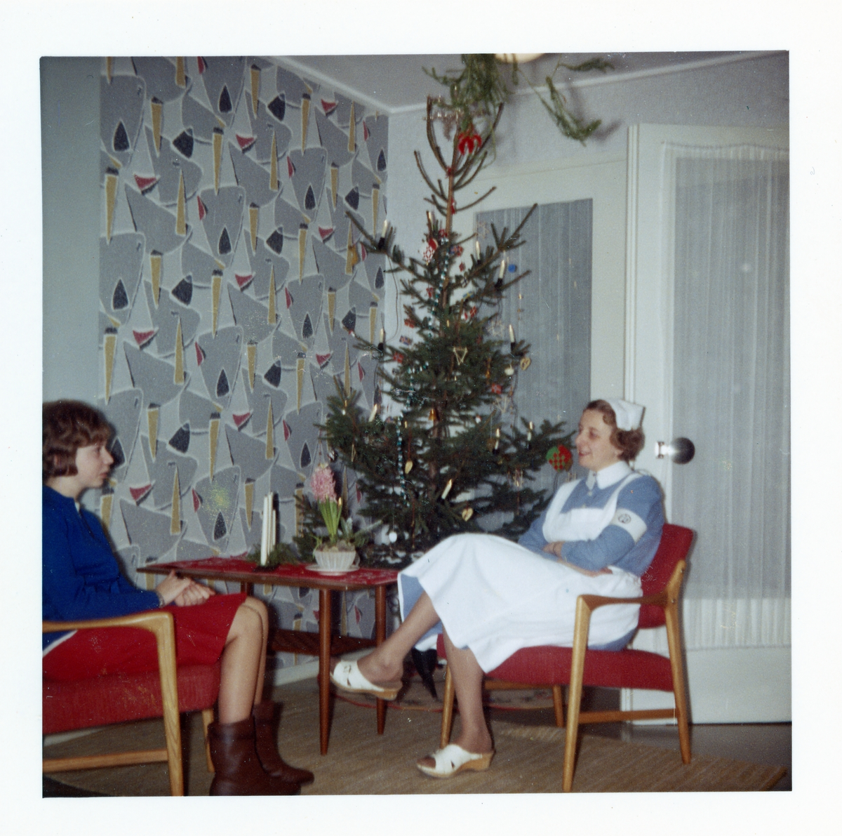 Fotografi på en barnsköterska och Inger på besök, julen 1962 på Lilla Källbäck.