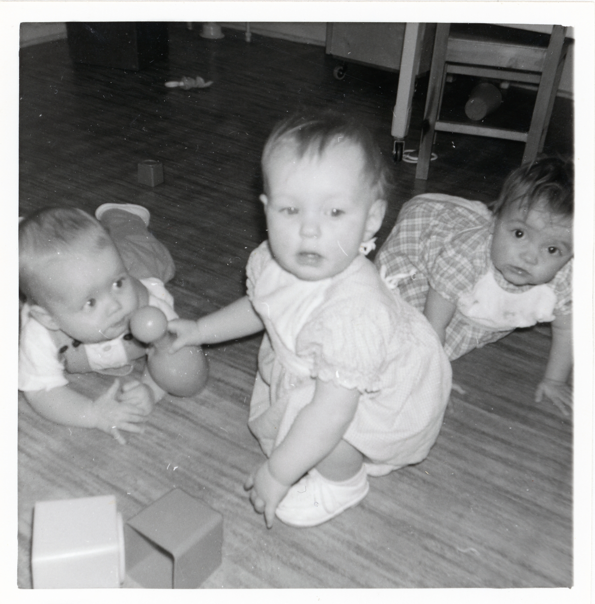 Fotografi på Reino, Carina och ? som leker på golvet i Lilla Källbäck.