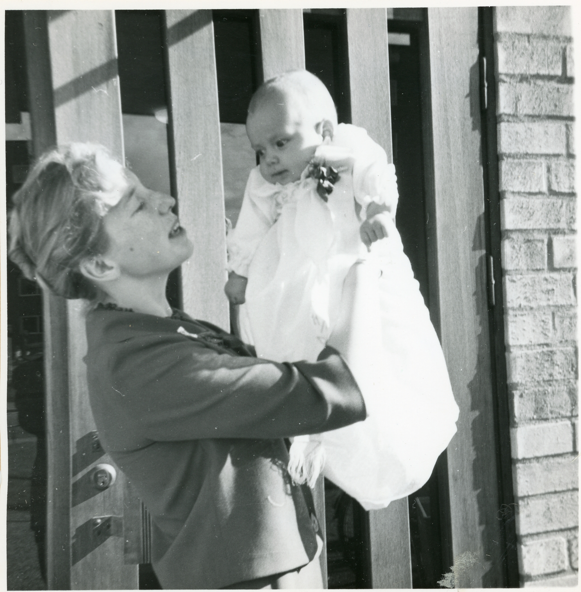Fotografi på Per 3 månader med dopklänning, hans dopdag, med en kvinna som håller upp honom.