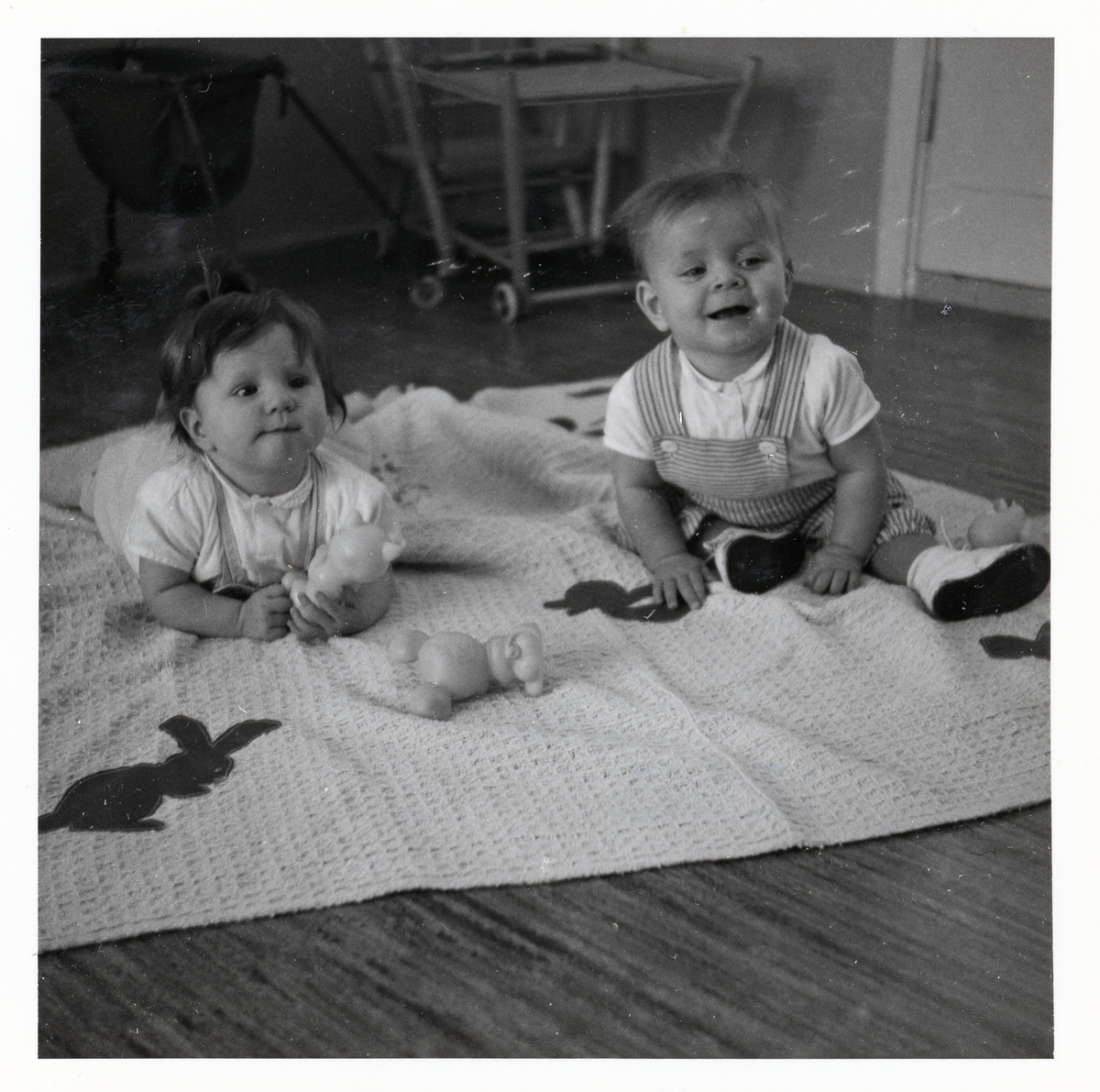 Fotografi på Susanna och Alf-Sixten som ligger på golvet på en filt i Lilla Källbäck.