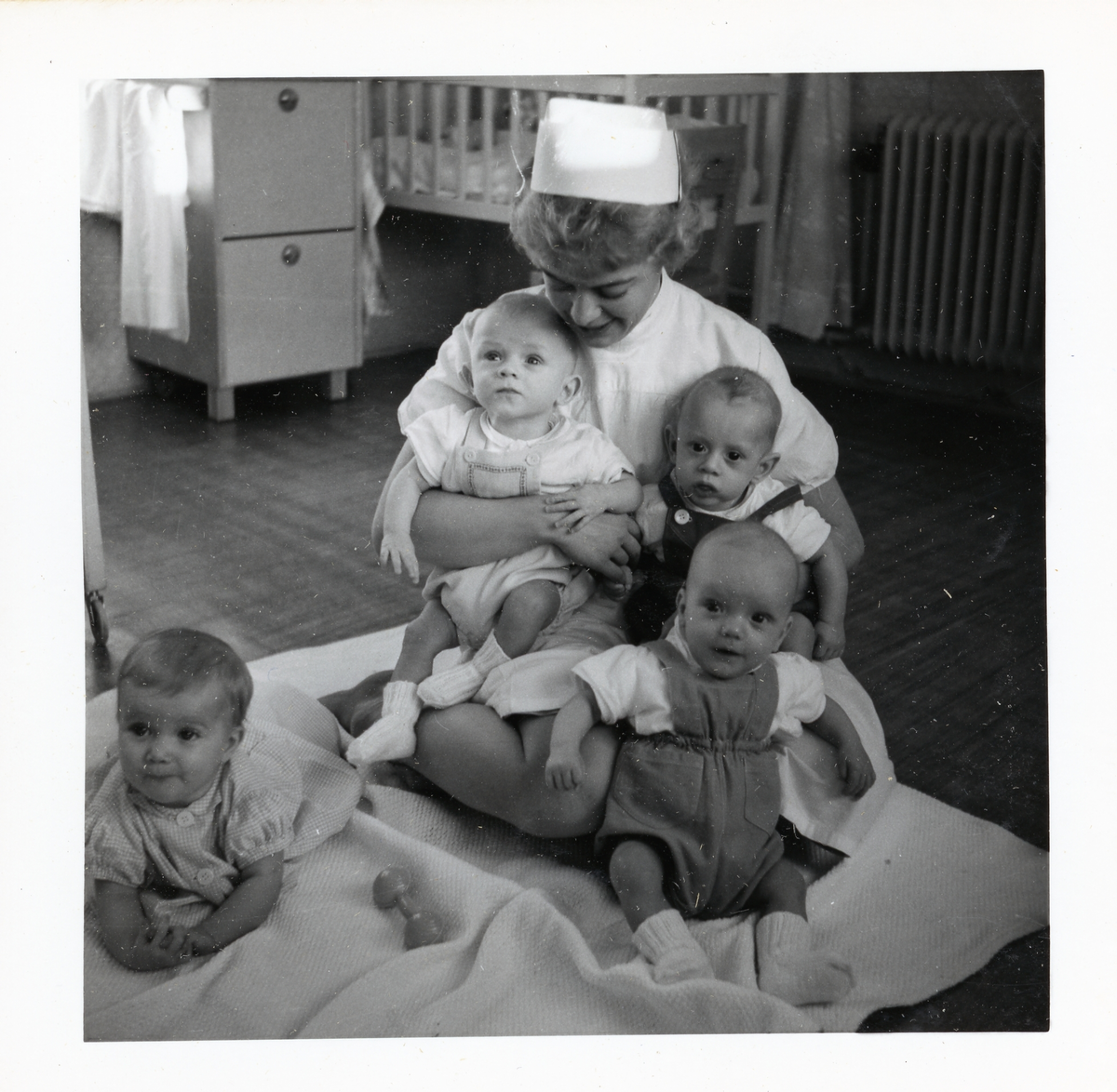 Fotografi på Marina, Mikael, Frank och Stig samt en barnsköterska som har två i famnen, på en filt i Lilla Källbäck.