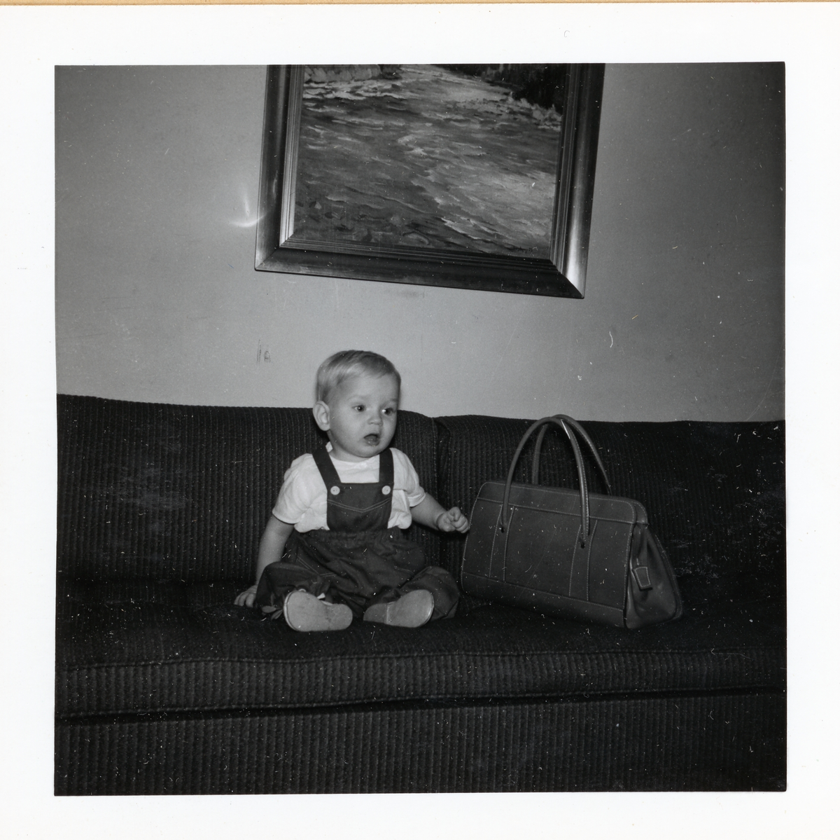 Fotografi på "Bedde" sittande på en soffa med en väska bredvid sig i Lilla Källbäck.