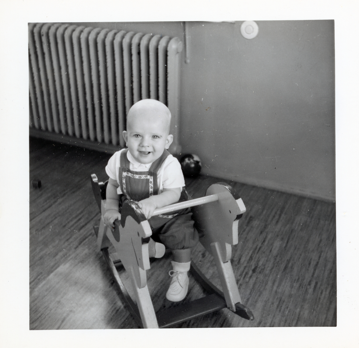 Fotografi på en glad Christer "Uff" sittande i en gunghäst i Lilla Källbäck.