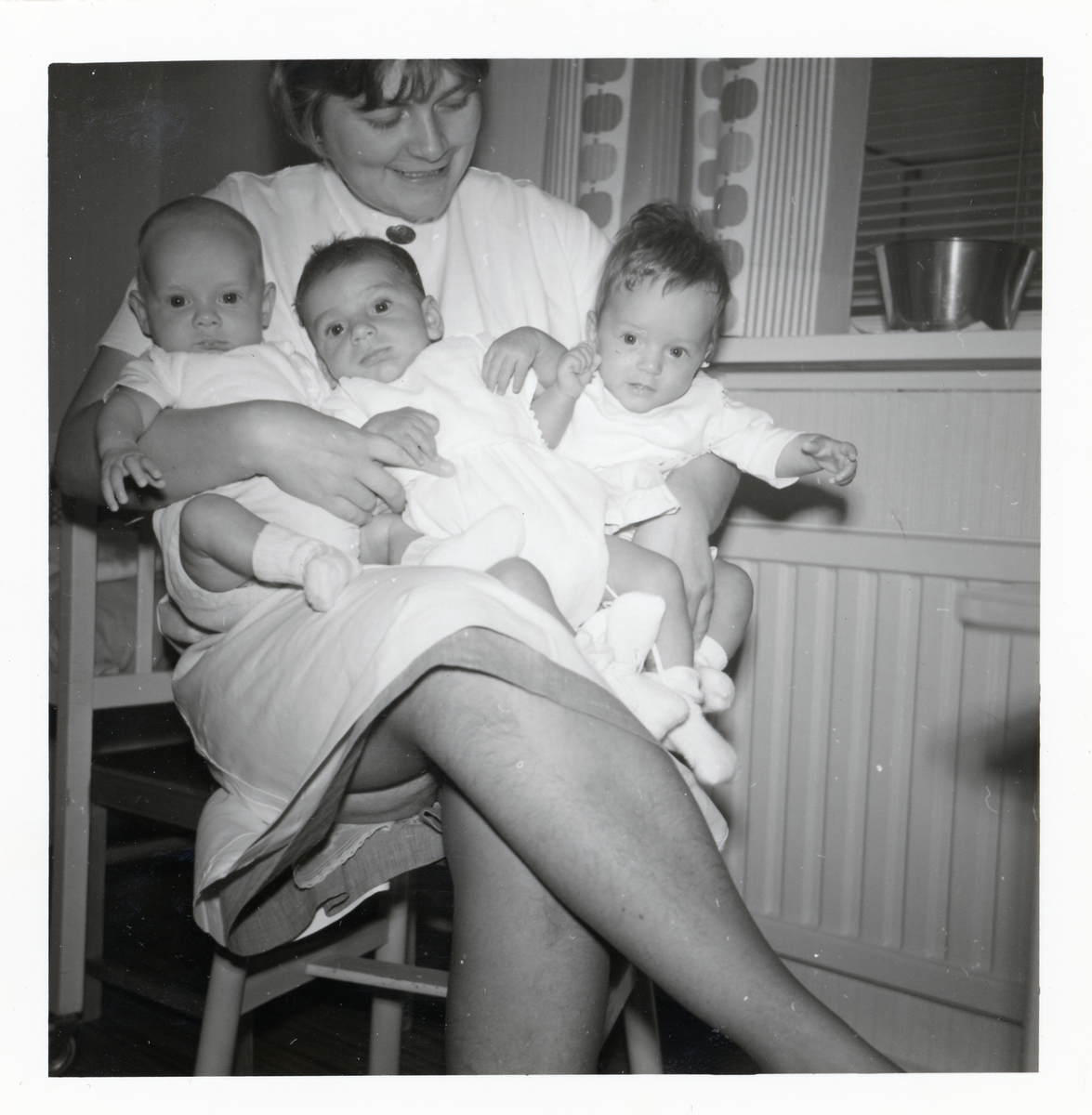 Titel: Fotografi på en barnsköterska med tre småttingar i sitt knä på Lilla Källbäck.