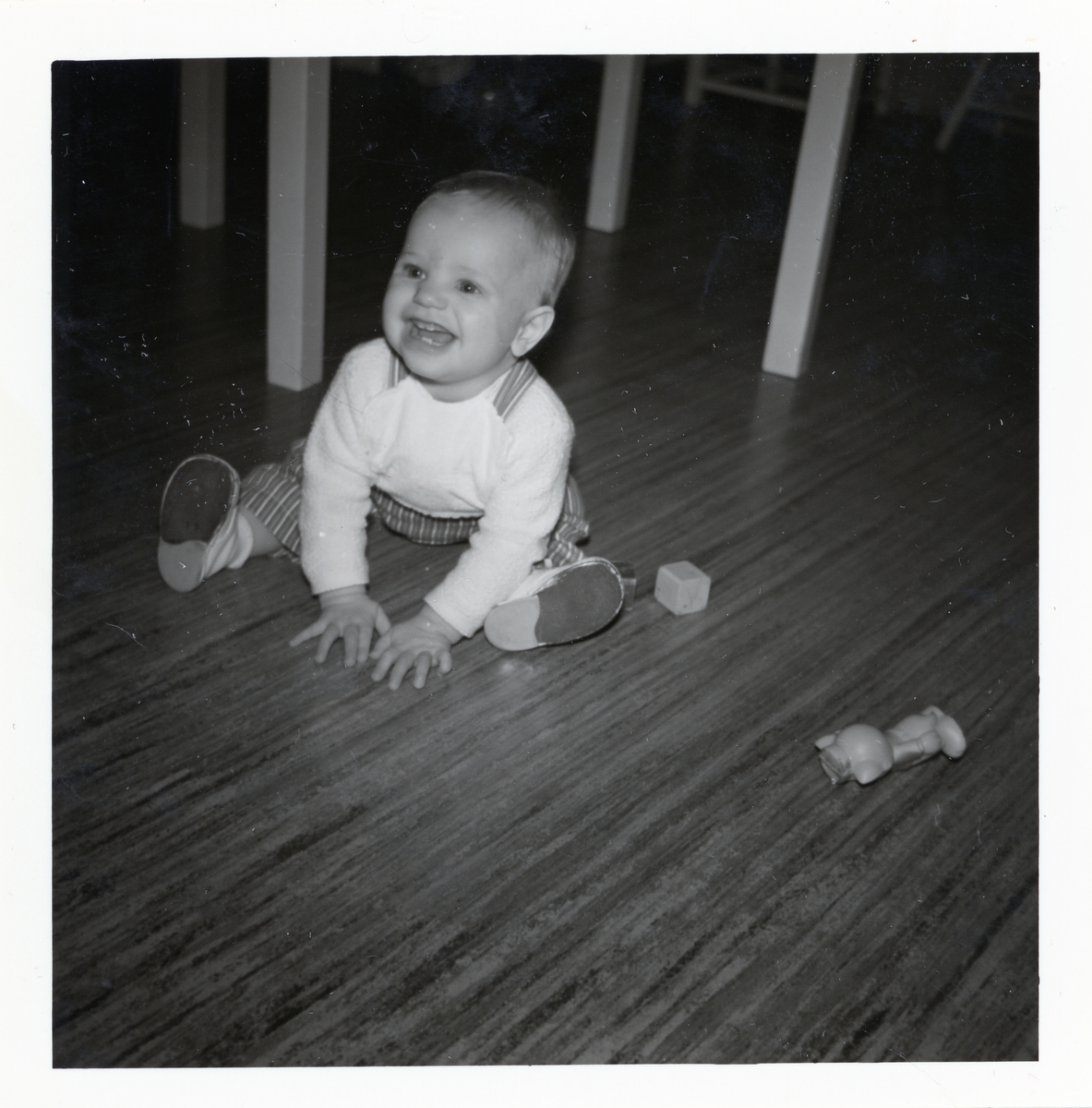 Fotografi på en gosse som sitter på golvet och leker med leksaker i Lilla Källbäck.