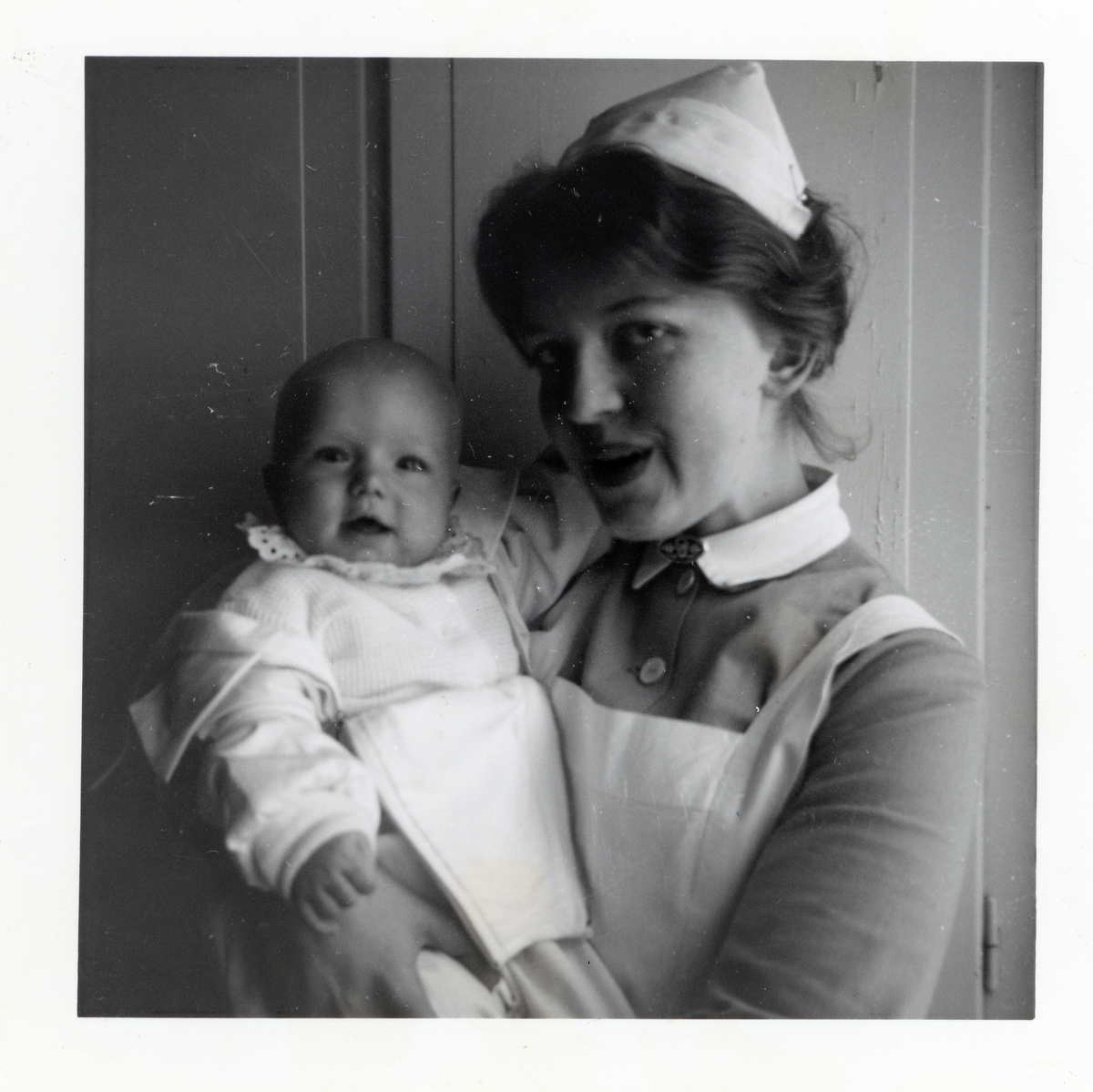 Fotografi på barnsköterska Kristina med barn i famnen på Lilla Källbäck.