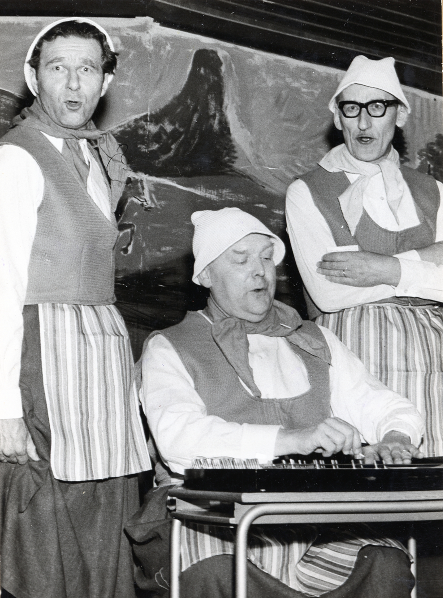 Titel: Fotografi på tre män utklädda till "Göingeflickorna" fr.v Ass? Melin, Dir. Thollander, Ass? Isacsson.