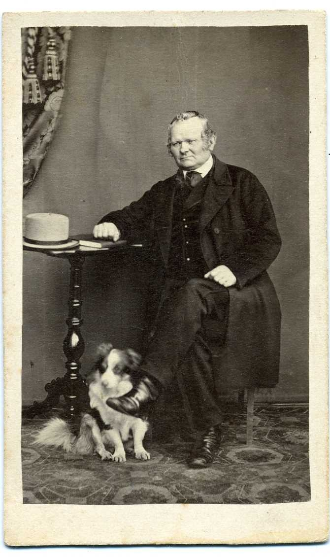 En man sitter vid ett runt pelarbord. På bordet ligger det en bok och en hatt. Vid mannens fötter sitter det en hund.