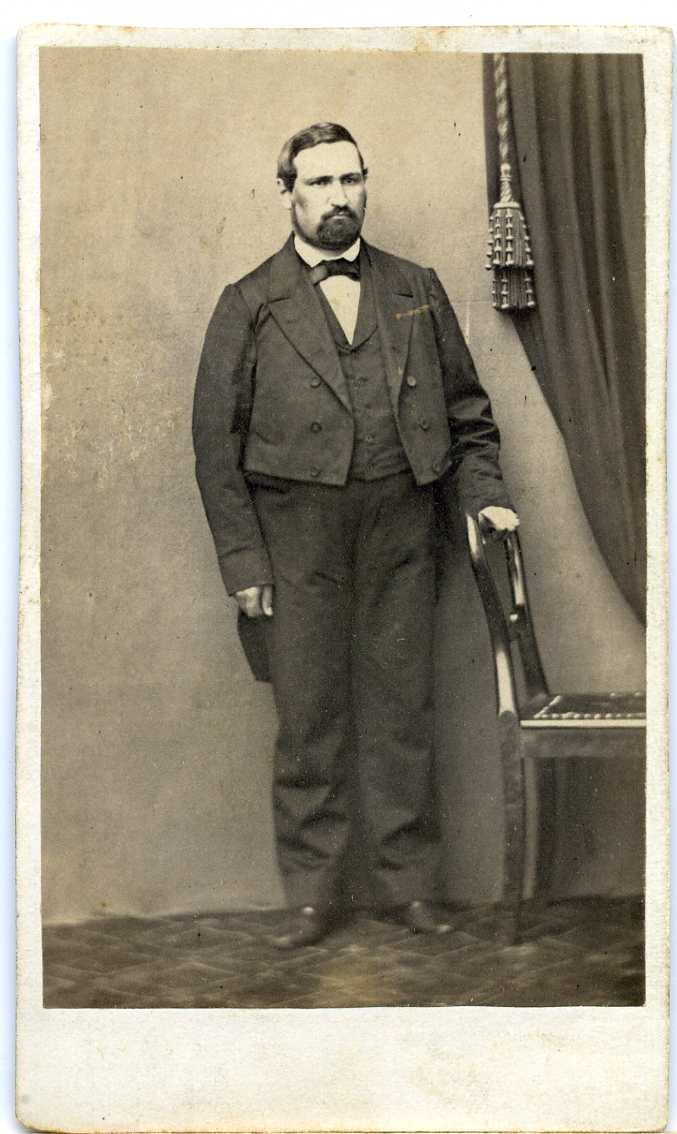 Porträtt av en man med skägg som står med vänster hand på en stolsrygg.