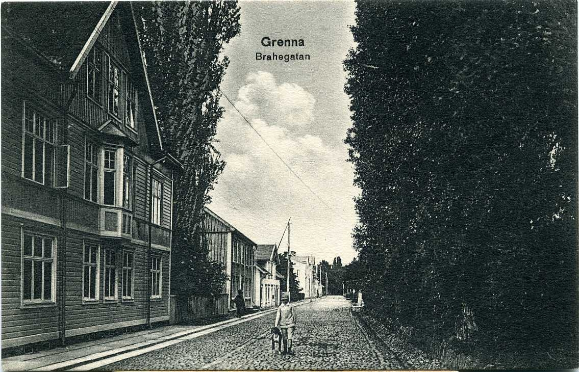 Vykort föreställande norra delen av Brahegatan i Gränna, kantad av popplar.