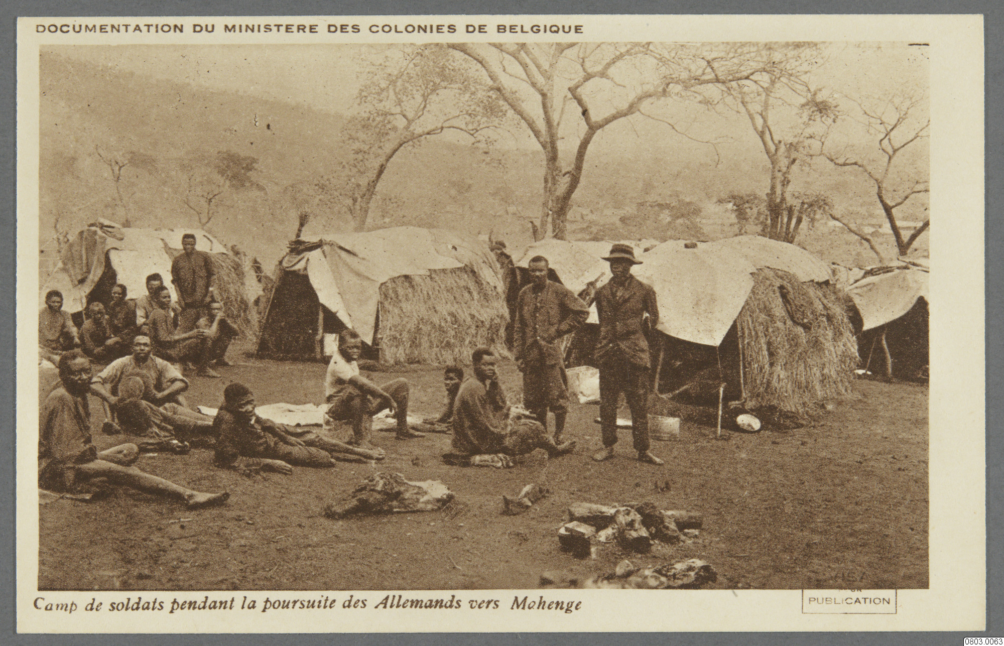 Vykort med motiv av ett soldatläger. Text på framsida: "Documentation du Ministere des Colonies de Belgique. Camp de soldats pendant la poursuite des allmands vers Mohenge." Text på baksida: "Carte Postale, Publiée au bénéfice de l'œuvre; "Asiles des soldats invalides Belges. Cabinet de Mr. le Ministre Vandervelde, Ste. Adresse, France (Seine Inférieure). Côte réservé à l'adresse."