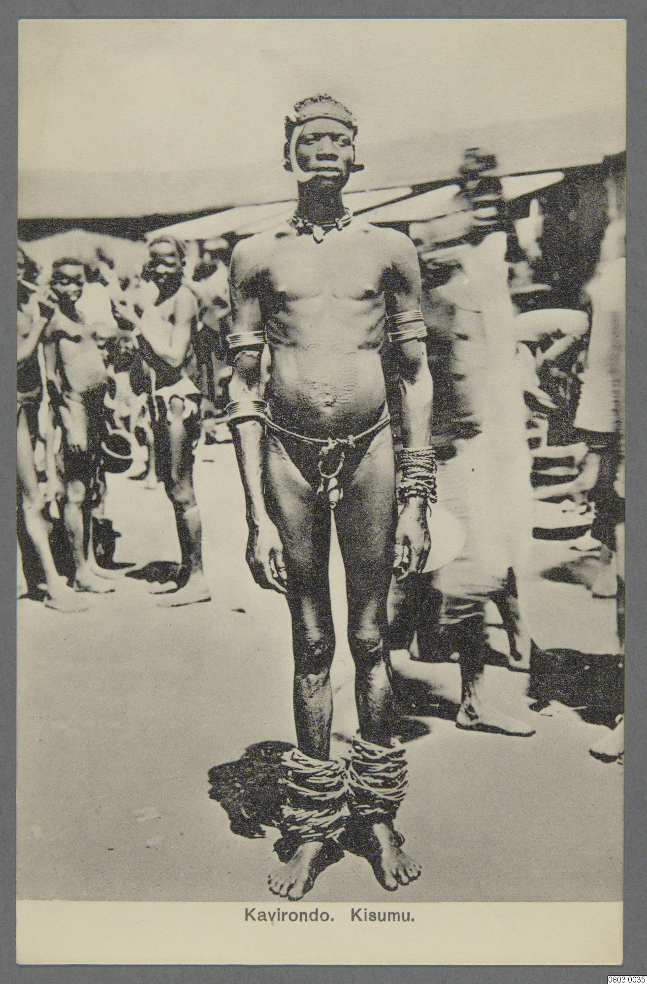 Vykort med motiv av man stående. Text på framsida: "Kavirondo. Kisumu" Text på baksida: "Post card. Made in Germany. Felix Coutinho, Photographer Mombassa"