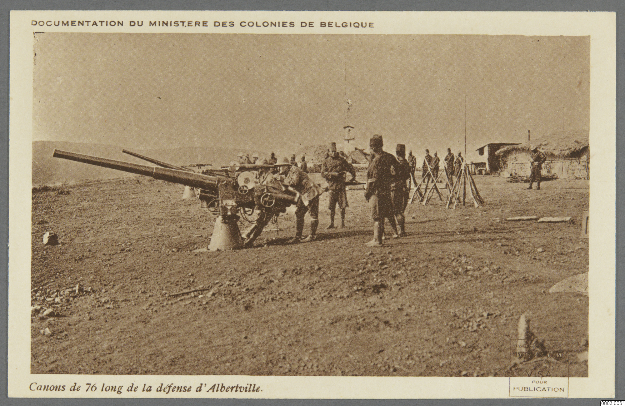 Vykort med motiv av soldater på fält med kanoner. Text på framsida: "Documentation du Ministere des Colonies de Belgique. Canons de 76 long de la défense d'Albertville." Text på baksida: "Carte Postale, Publiée au bénéfice de l'œuvre; "Asiles des soldats invalides Belges. Cabinet de Mr. le Ministre Vandervelde, Ste. Adresse, France (Seine Inférieure). Côte réservé à l'adresse."