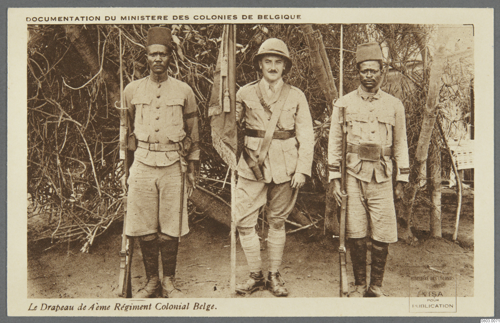 Vykort med motiv av tre soldater stående med regementesflagga. Text på framsida: "Documentation du Ministere des Colonies de Belgique. Le Drapeau de Aè Regiment Conoial Belge." Text på baksida: "Carte Postale, Publiée au bénéfice de l'œuvre; "Asiles des soldats invalides Belges. Cabinet de Mr. le Ministre Vandervelde, Ste. Adresse, France (Seine Inférieure). Côte réservé à l'adresse."