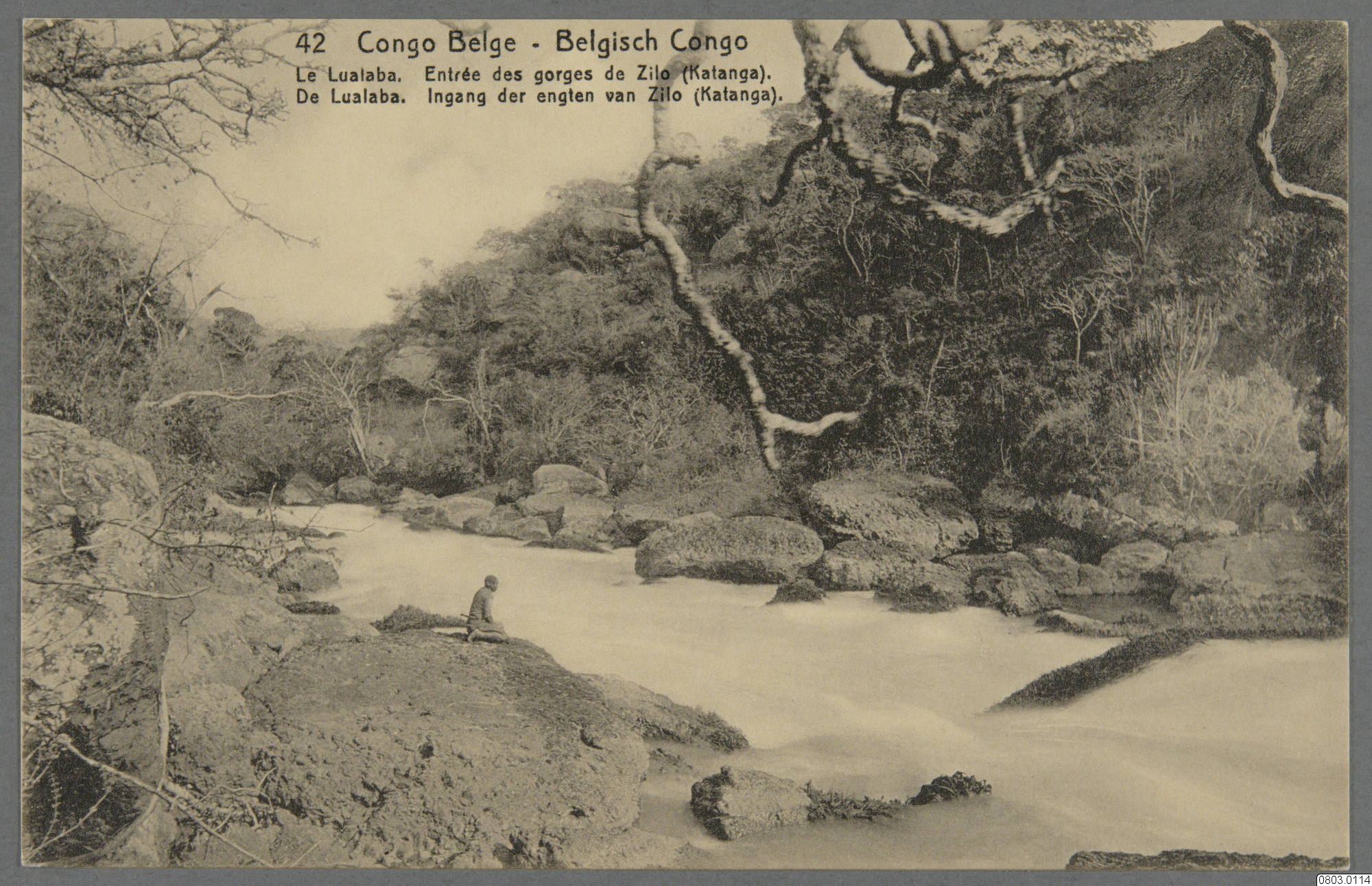 Vykort med motiv av Lualabafloden och början av vattenmagasinet Lac Nzilos. Text på framsida: "Congo Belge, Belgisch Congo, Le Lualaba, Entrée des gorges de Zilo (Katanga), De Lualaba, Ingang der engten van Zilo. (Katanga)" Text på baksida: "Congo Belge, Belgisch Congo, Carte Postale, Postkaart, Correspondance, Briefwisseling, Adresse, Adres."