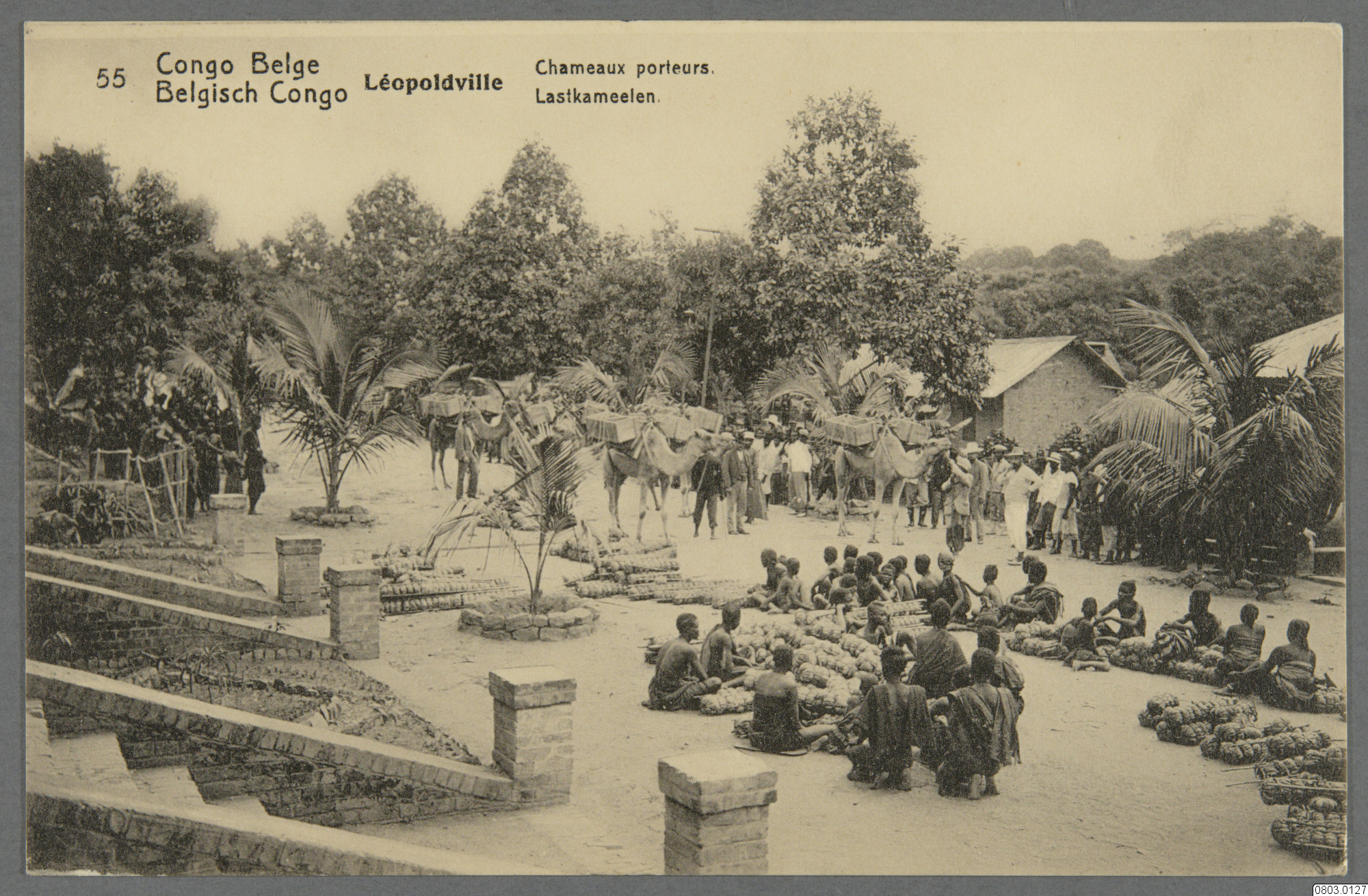 Vykort med motiv av dromedarer med last och urinvånare i Lusambo. Text på framsida: "Congo Belge, Belgisch Congo, Léopoldville, Chameaux porteurs, Lastkameelen." Text på baksida: "Congo Belge, Belgisch Congo, Carte Postale, Postkaart, Correspondance, Briefwisseling, Adresse, Adres."