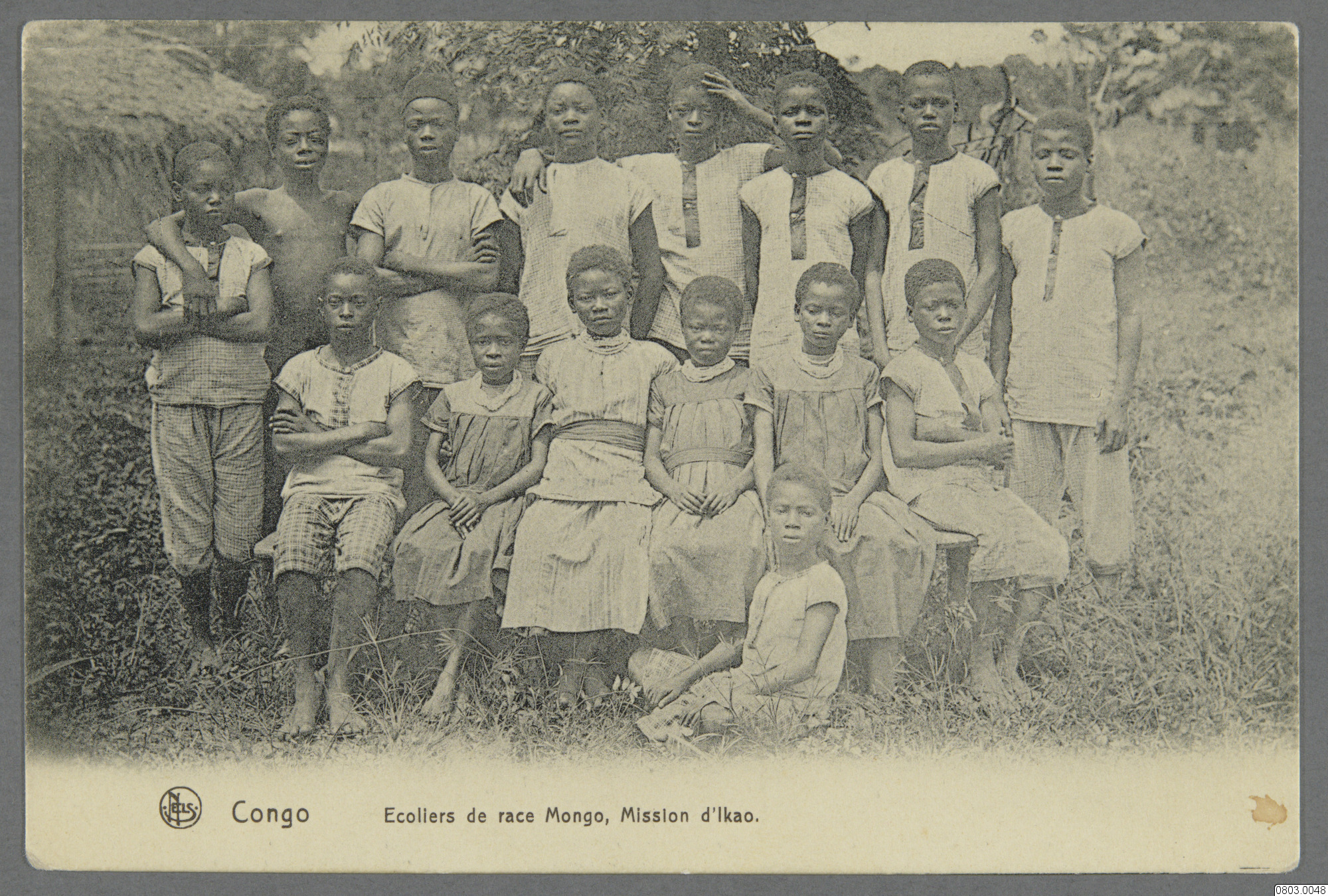 Vykort med motiv av gruppbild, en skolklass. Text på framsida: "Congo. Ecoliers de race Mongo, Mission d'lkao" Text på baksida: "Carte Postale, Correspondance, Adresse, Ed. Nels, Bruxelles. Serie 14 No. 11. "