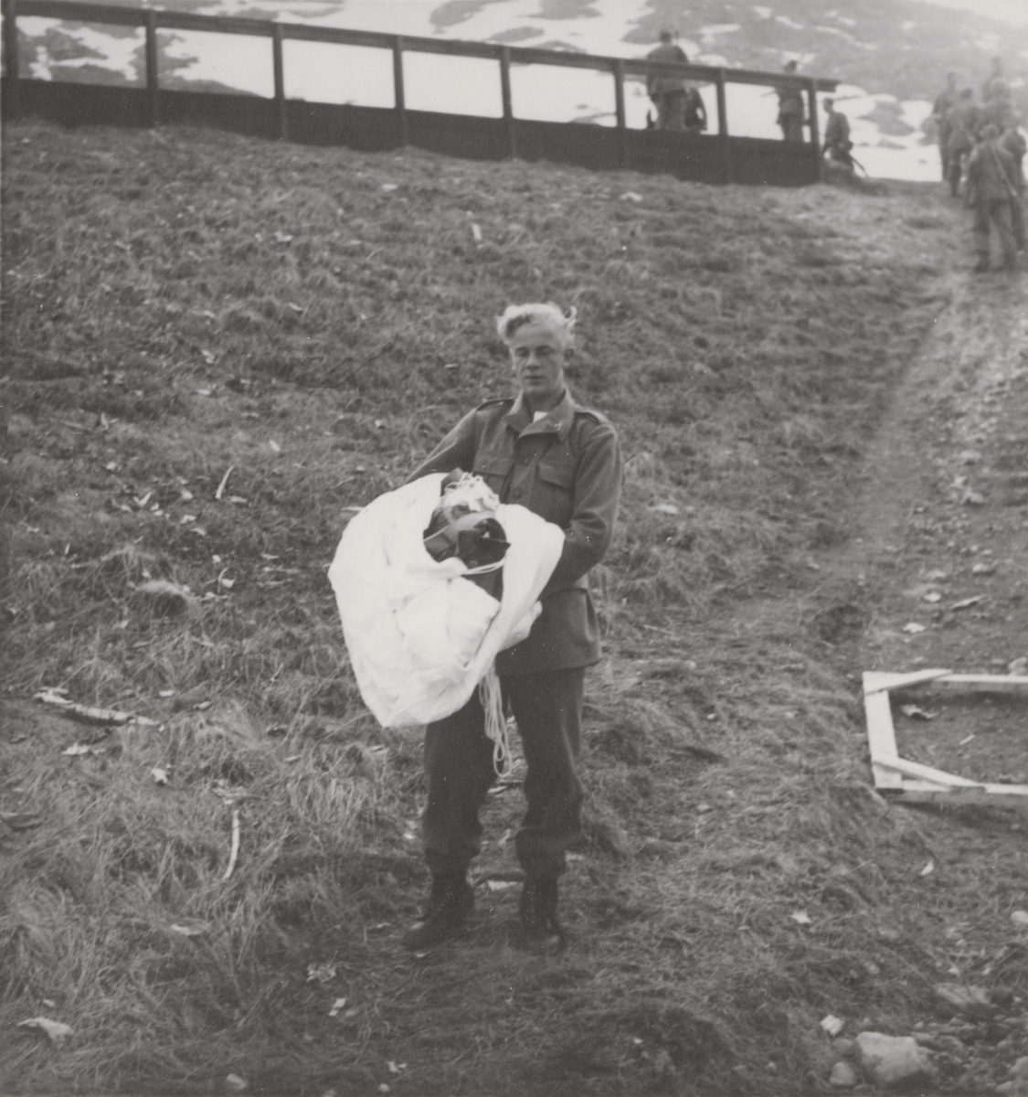 Titel: Skidlöpare har hittat en fallskärm uppe på fjället. Foto ur anonym serie från beredskapen i Norrland.