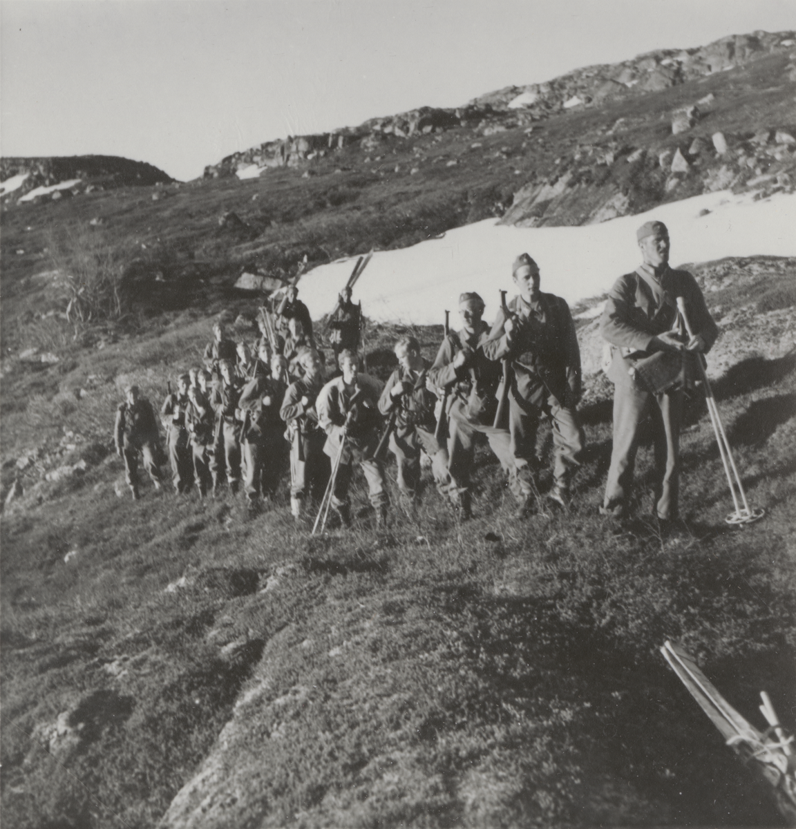 Titel: Soldater på väg uppför en backe. Foto ur anonym serie från beredskapen i Norrland.