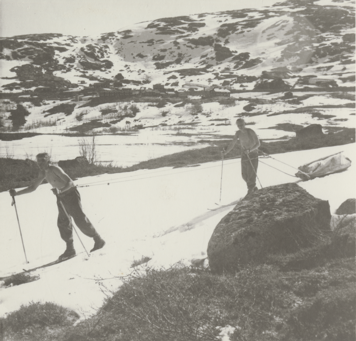 Proviant transporteras med pulka till Njutunaposteringen. Foto ur anonym serie från beredskapen i Norrland.