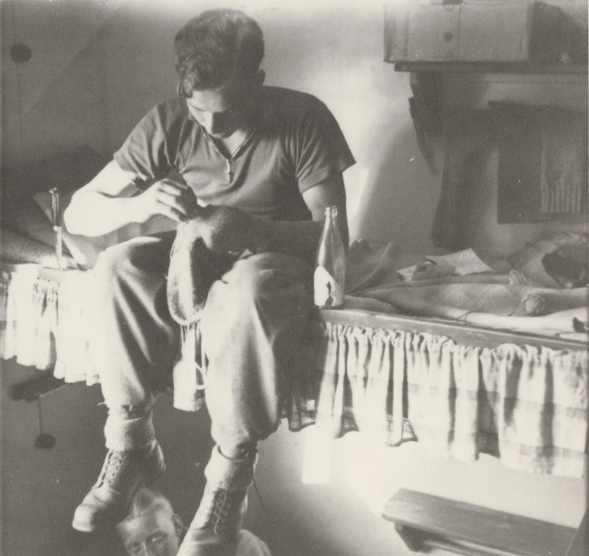 Persedelvård: 245 Johansson stoppar ett hål i sin strumpa. Foto ur anonym serie från beredskapen i Norrland.