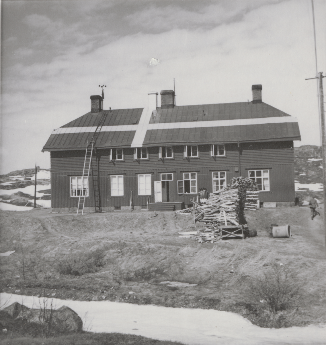 Titel: Hustak med målad svensk flagga. Foto ur anonym serie från beredskapen i Norrland.