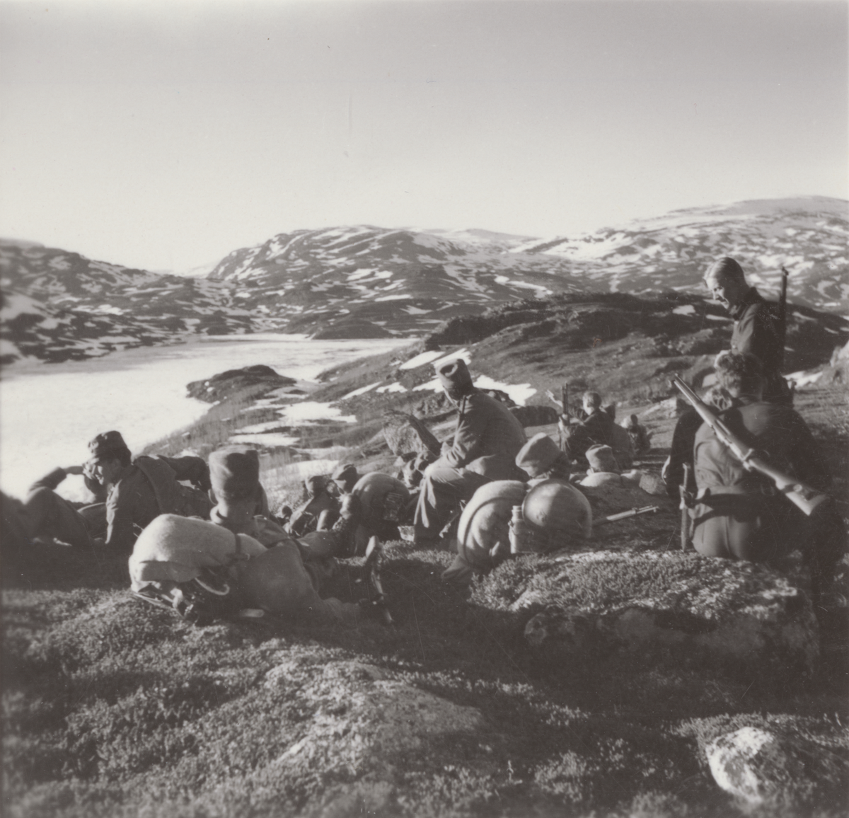 Titel: Rast på hög höjd. Foto ur anonym serie från beredskapen i Norrland.