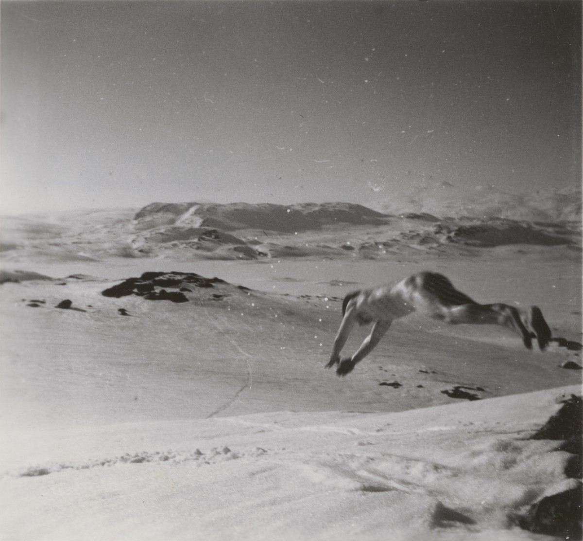 Titel: Man dyker ner i en snödriva. Foto ur anonym serie från beredskapen i Norrland.