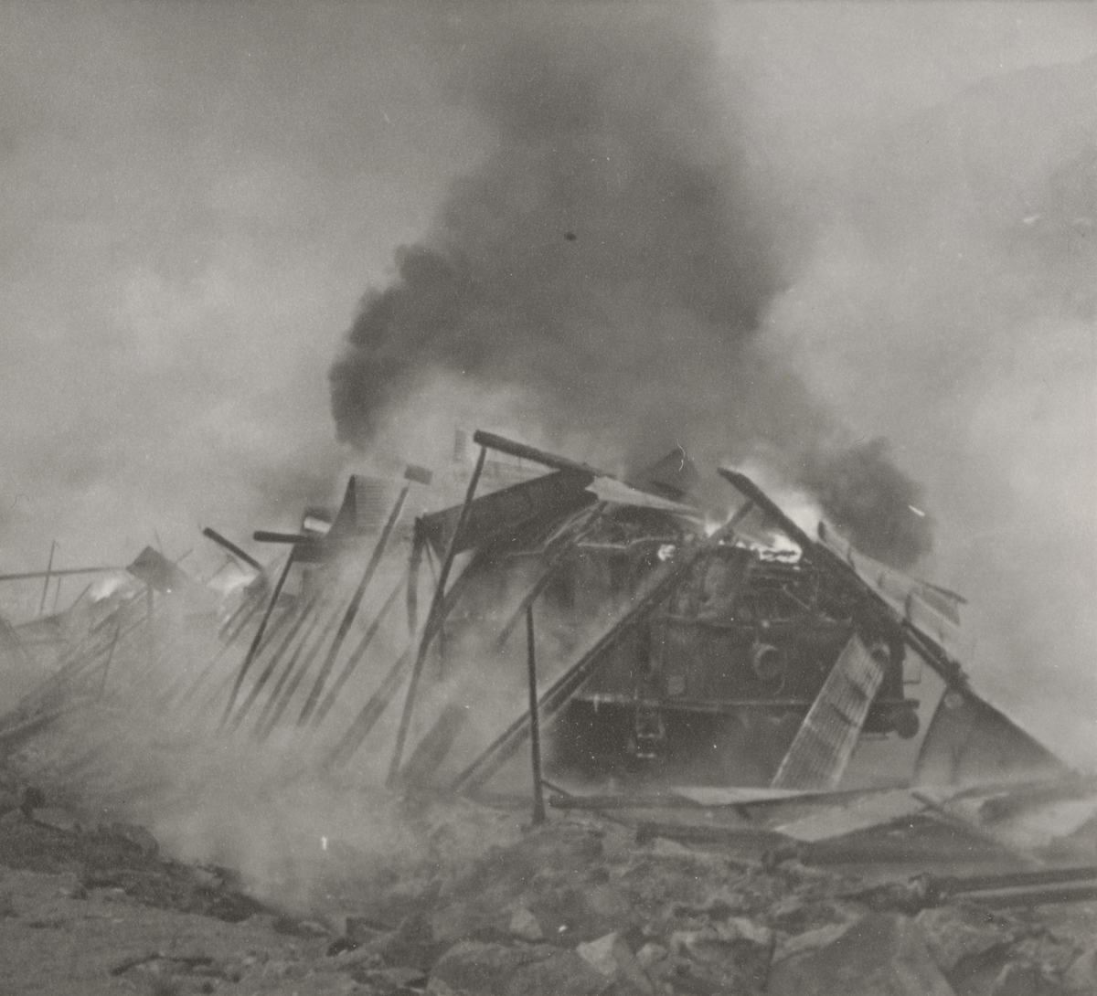 Titel: Brinnande lok vid riksgränsen. Foto ur anonym serie från beredskapen i Norrland.